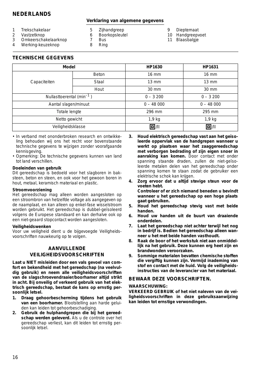 NEDERLANDS Verklaring van algemene gegevens 1 Trekschakelaar 5 Zihandgreep 9 Dieptemaat 2 Vastetknop 6 Boorkopsleutel 10 Handgreepvoet 3 Omkeerschakelaarknop 7 Bus 11 Blaesbalgie 4 Werking-keuzeknop 8 Ring TECHNISCHE GEGEVENS Model HP1630 HP1631 Beton 16 mm 16 mm Capaciteiten Stal 13 mm 13 mm Hout 30 mm 30 mm Nullastioerental (min) 0- 3200 0- 3200 Aantal slagen/minuut 0- 48 000 0- 48 000 Totale lengte 296 mm 295 mm Netto gewicht L9Kg 19 kg Veiligheidsklasse [ON [OT + In verband met ononderbroken research en ontwikke- 3. Houd elektrisch gereedschap vast aan het geïso- ling behouden wi ons het recht voor bovenstaande leerde opperviak van de handgrepen wanneer u technische gegevens te wijzigen zonder voorafgaande werkt op plaatsen waar het zaaggereedschap Kennisgeving. met verborgen bedrading of zijn eigen snoer in + Opmerking: De technische gegevens kunnen van land aanraking kan komen. Door contact met onder totland verschillen. spanning staande draden, zullen de niet-geïso- Doeleinden van gebruïk leerde metalen delen van het gereedschap onder Dit gereedschap is bedoeld voor het slagboren in bak- spanning komen te staan zodat de gebruker een steen, beton en steen, en ook voor het gewoon boren in clektische schok kan krigen. hout, metaal, keramisch material en plastic. 4 Zorg ervoor dat u altid stevige steun vaor de voeten hebt. Stroomvoorziening Controleer of er zich niemand beneden u bevindt Het gereedschap mag alleen worden aangesloten op wannéer u het gereedschap op een hoge plaats een stroombron van hetzelfde voltage als aangegeven op gaat gebruiken. de naamplaat, en kan alleen op enkelfase wisselstroom 5, Houd het gereedschap stevig vast met beide worden gebruikt. Het gereedschap is dubbel-geïsoleerd handen. volgens de Europese standaard en kan derhalve 00k op 6. Houd uw handen uit de buurt van draaiende een niet-geaard stopcontact worden aangesloten onderdelen. Veiligheidswenken 7. Laat het gereedschap niet achter terwijl het nog Voor uw veiligheid dient u de bijgevoegde Veiligheids- in bedrijfis. Bedien het gereedschap alleen wan- voorschrifen nauwkeurig op te volgen: ner u het met beide handen vasthoudt.