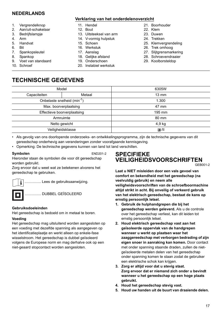 Boorhouder Klem Duwen Trekken Klemvergrendeling Trek omhoog Slijtgrensmarkering Schroevendraaier Koolborsteldop TECHNISCHE GEGEVENS Model Capaciteiten 6305W Metaal 13 mm Onbelaste snelheid (min-1)