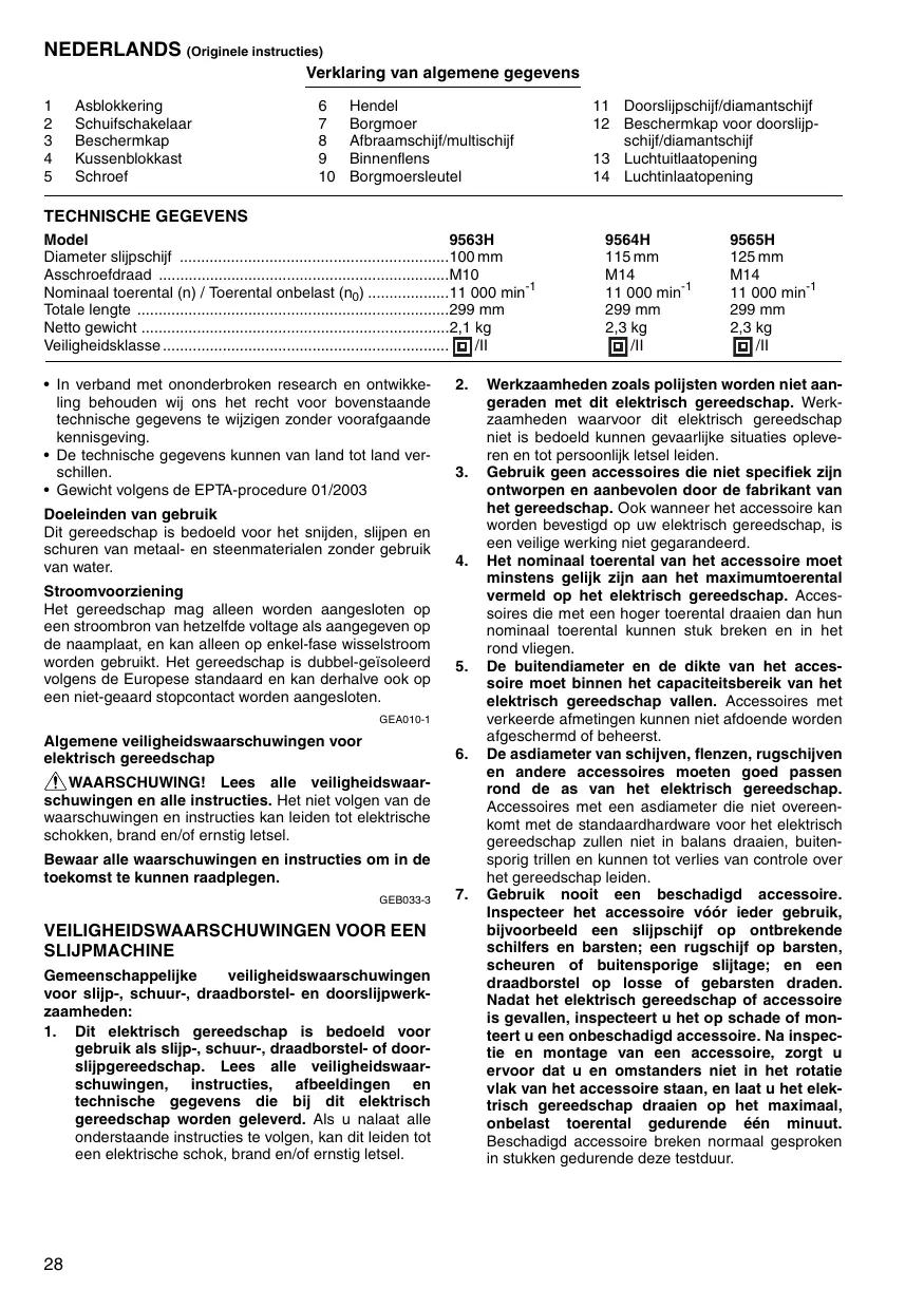 Hendel Borgmoer Afbraamschijf/multischijf Binnenflens Borgmoersleutel 11 Doorslijpschijf/diamantschijf 12 Beschermkap voor doorslijpschijf/diamantschijf 13 Luchtuitlaatopening 14 Luchtinlaatopening TECHNISCHE GEGEVENS Model 9563H Diameter slijpschijf ...............................................................100 mm Asschroefdraad ....................................................................M10 Nominaal toerental (n) / Toerental onbelast (n0) ...................11 000 min-1 Totale lengte .........................................................................299 mm Netto gewicht ........................................................................2,1 kg Veiligheidsklasse ................................................................... /II