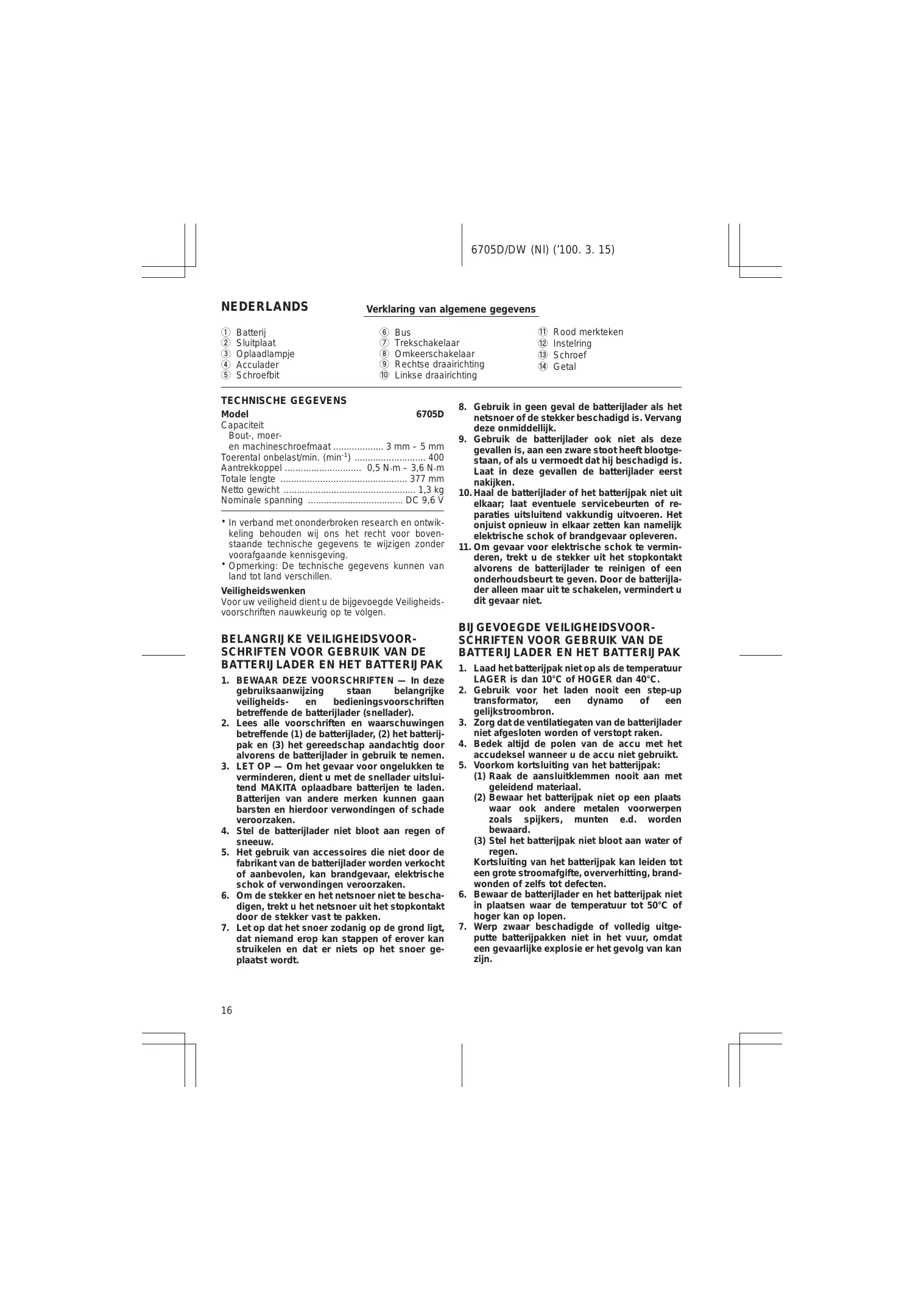 TECHNISCHE GEGEVENS Model 6705D Capaciteit Bout-, moeren machineschroefmaat 3 mm – 5 mm Toerental onbelast/min. (min-1) 400 Aantrekkoppel 0,5 N.m – 3,6 N.m Totale lengte 377 mm Netto gewicht 1,3 kg Nominale spanning DC 9,6 V • In verband met ononderbroken research en ontwikkeling behouden wij ons het recht voor bovenstaande technische gegevens te wijzigen zonder voorafgaande kennisgeving. • Opmerking: De technische gegevens kunnen van land tot land verschillen. Veiligheidswenken Voor uw veiligheid dient u de bijgevoegde Veiligheidsvoorschriften nauwkeurig op te volgen.