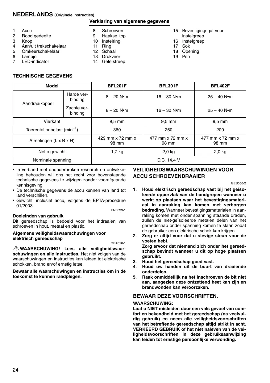 ENG905-1 Geluidsniveau De typisch, A-gewogen geluidsniveaus vastgesteld volgens EN60745: Model BFL201F, BFL402F Geluidsdrukniveau (LpA): 72 dB (A) Onnauwkeurigheid (K): 3 dB (A) Tijdens het werken kan het geluidsniveau 80 dB (A) overschrijden. Model BFL301F Geluidsdrukniveau (LpA): 74 dB (A) Onnauwkeurigheid (K): 3 dB (A) Tijdens het werken kan het geluidsniveau 80 dB (A) overschrijden. Draag oorbeschermers ENG900-1 Trilling De totaalwaarde van de trillingen (triaxiale vectorsom) vastgesteld volgens EN60745: Toepassing: schroeven zonder slag Trillingsemissie (ah): 2,5 m/s2 of lager Onnauwkeurigheid (K): 1,5 m/s2 ENG901-1