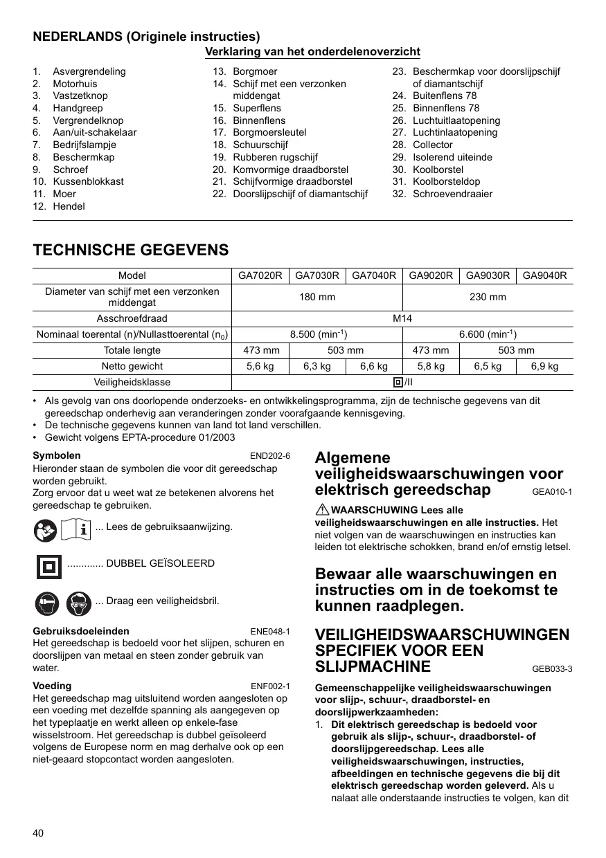 1. Asvergrendeling 13. Borgmoer 23. Beschermkap voor doorsiijpschijf 2. Motorhuis 14. Schijf met een verzonken of diamantschijf 3. Vastzetknop middengat 24. Buitenflens 78 4. Handgreep 15. Superflens 25. Binnenfens 78 5. Vergrendelknop 16. Binnenflens 26. Luchtuitlaatopening 6. Aanluit-schakelaar 17. Borgmoersleutel 27. Luchtinlaatopening 7. Bedrifslampje 18. Schuurschif 28. Collector 8. Beschermkap 19. Rubberen rugschif 29. Isolerend uiteinde 9. Schroef 20. Komvormige draadborstel 30. Koolborstel 10. Kussenblokkast 21. Schifvormige draadborstel 31. Koolborsteldop 11. Moer 22. Doorsiijpschijf of diamantschif 32. Schroevendraaier 12. Hendel TECHNISCHE GEGEVENS Model GA7020R | GA7030R | GA7040R | GA9020R | GAS030R | GAS040R Diameter van schijf met een verzonken middengat 180 mm 230 mm Asschroefdraad M14 Nominaal toerental (n)Nullasttoerental (no) 8.500 (min) 6.600 (min) Totale lengte 473 mm 503 mm 473 mm 503 mm Netto gewicht 5,6 kg 63kg | 66kg 5,8 kg 65kg | 69kg