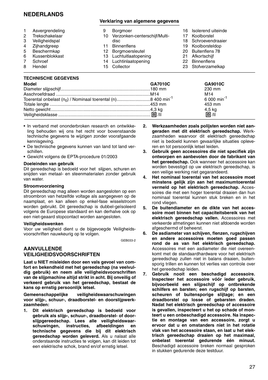 TECHNISCHE GEGEVENS Model GA7010C Diameter slijpschijf180 mm Asschroefdraad M14 Toerental onbelast (n0) / Nominaal toerental (n)8 400 min-1 Totale lengte 453 mm Netto gewicht 4,3 kg Veiligheidsklasse /II • In verband met ononderbroken research en ontwikkeling behouden wij ons het recht voor bovenstaande technische gegevens te wijzigen zonder voorafgaande kennisgeving. • De technische gegevens kunnen van land tot land verschillen. • Gewicht volgens de EPTA-procedure 01/2003 Doeleinden van gebruik Dit gereedschap is bedoeld voor het slijpen, schuren en snijden van metaal- en steenmaterialen zonder gebruik van water. Stroomvoorziening Dit gereedschap mag alleen worden aangesloten op een stroombron van hetzelfde voltage als aangegeven op de naamplaat, en kan alleen op enkel-fase wisselstroom worden gebruikt. Dit gereedschap is dubbel-geïsoleerd volgens de Europese standaard en kan derhalve ook op een niet-geaard stopcontact worden aangesloten. Veiligheidswenken Voor uw veiligheid dient u de bijgevoegde Veiligheidsvoorschriften nauwkeurig op te volgen.