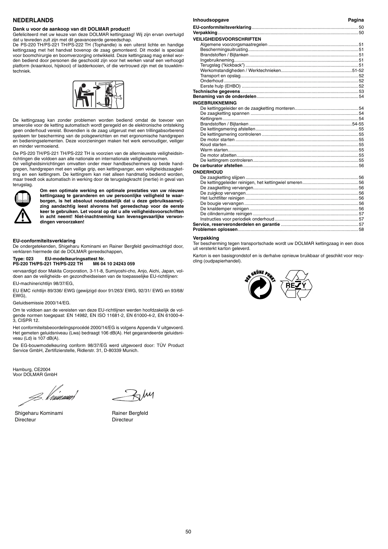 EU-conformiteitsverklaring De ondergetekenden, Shigeharu Kominami en Rainer Bergfeld gevolmachtigd door, verklaren hiermede dat de DOLMAR gereedschappen,