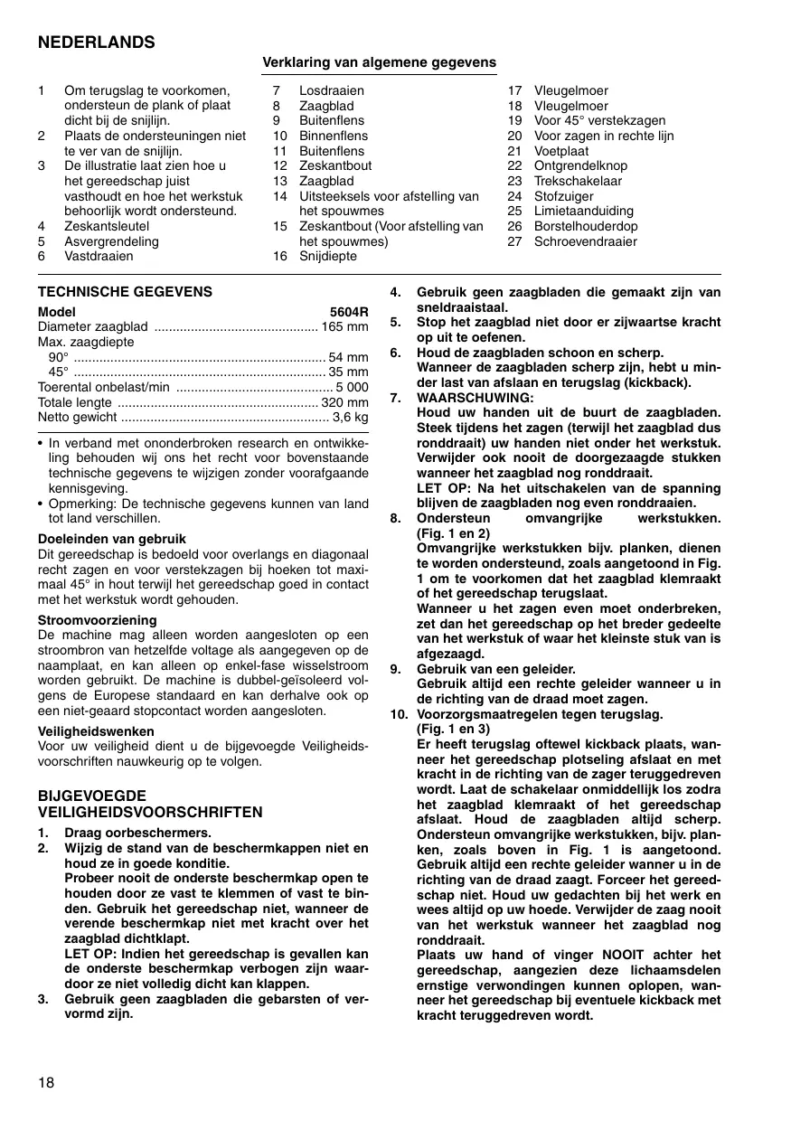 - Losdraaien Zaagblad Buitenflens Binnenflens Buitenflens Zeskantbout Zaagblad Uitsteeksels voor afstelling van het spouwmes 15 Zeskantbout (Voor afstelling van het spouwmes) 16 Snijdiepte TECHNISCHE GEGEVENS Model 5604R Diameter zaagblad p. 165