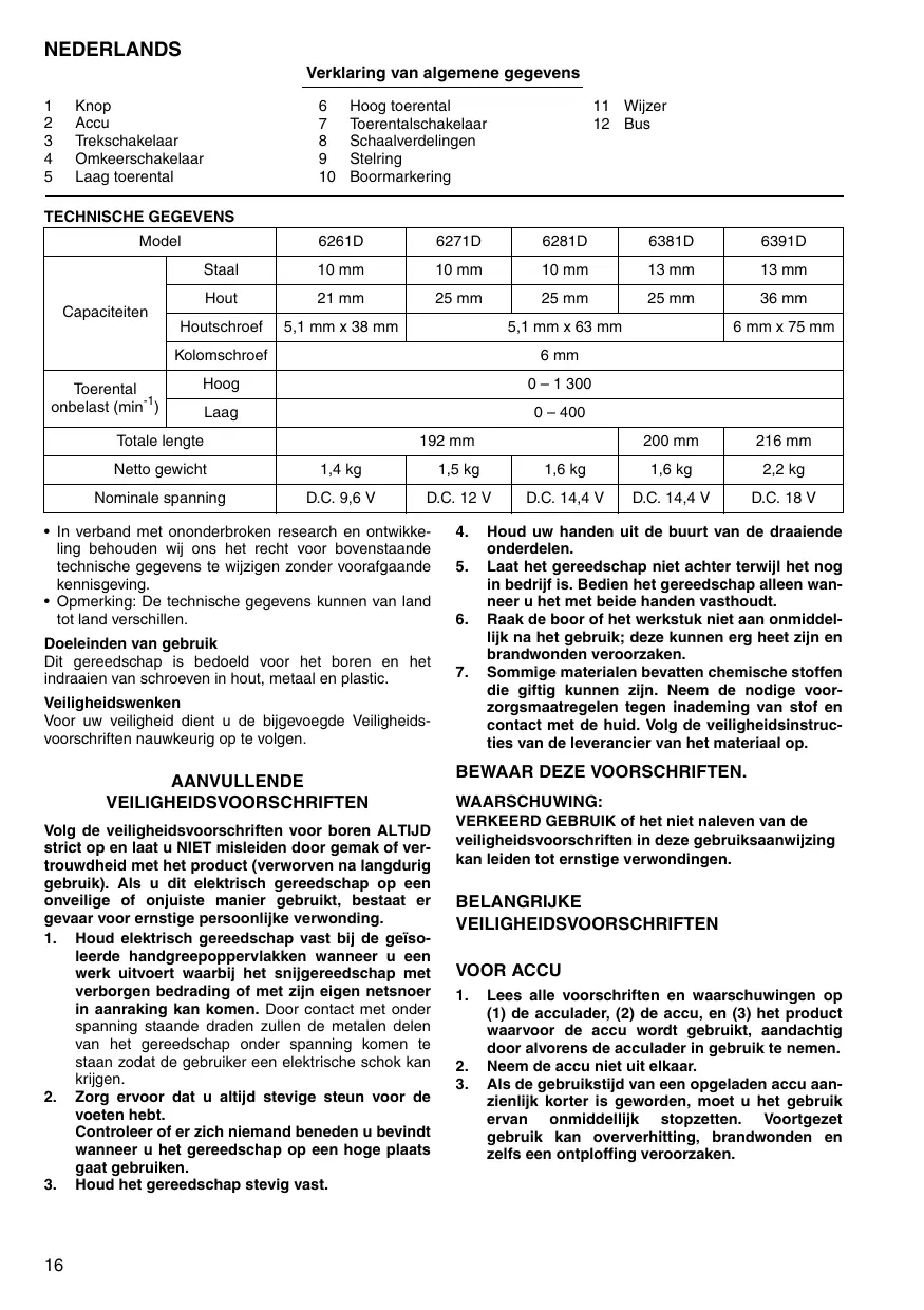 Volg de veiligheidsvoorschriften voor boren ALTIJD strict op en laat u NIET misleiden door gemak of ver Trouwdheid met het product (verworven na langdurig gebruik). Als u dit elektrisch gereedschap op een onveilige of onjuiste manier gebruikt, bestaat er gevaar voor ernstige persoonlijke verwonding.