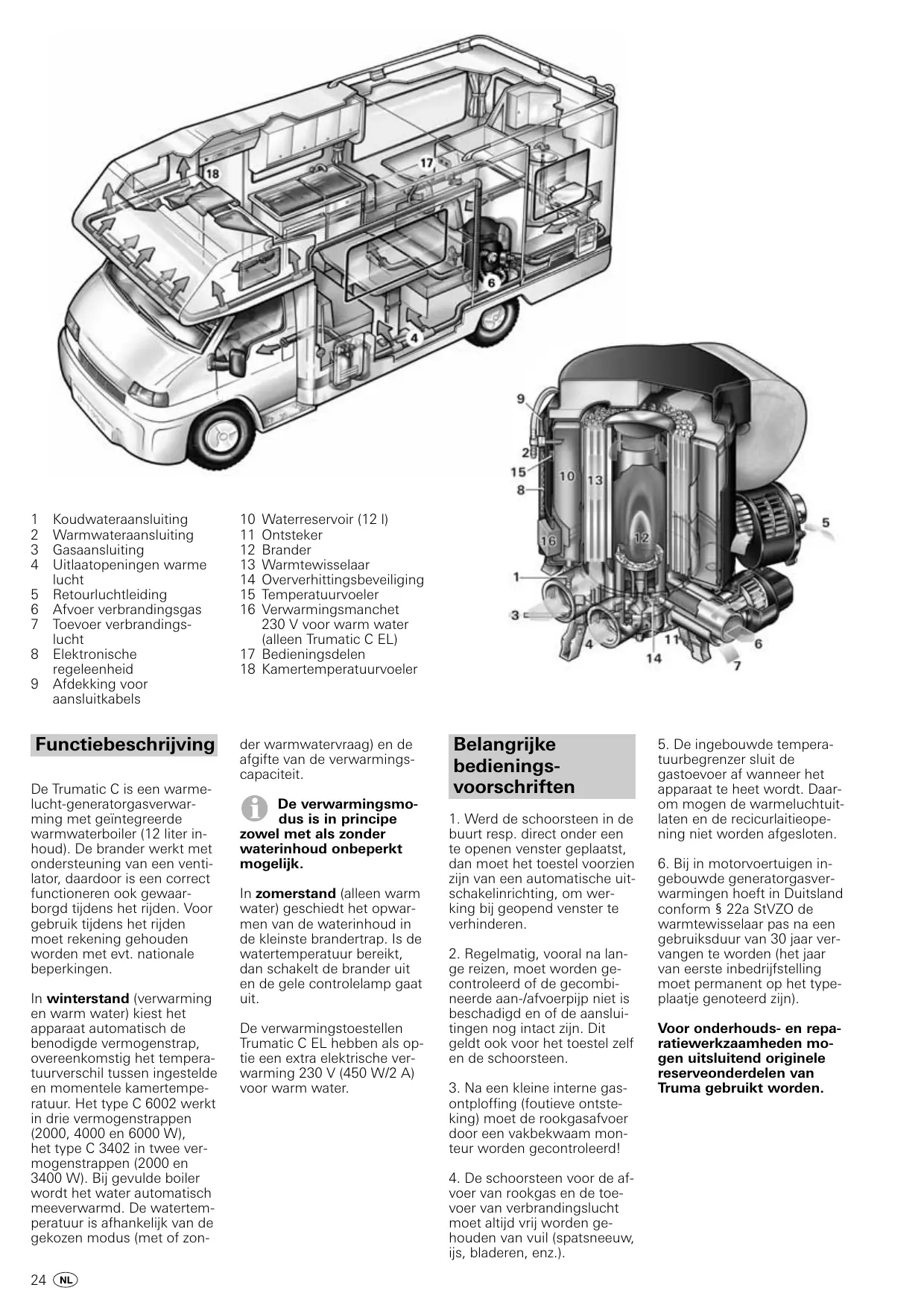 Koudwateraansluiting Warmwateraansluiting Gasaansluiting Uitlaatopeningen warme lucht Retourluchtleiding Afvoer verbrandingsgas Toevoer verbrandingslucht Elektronische regeleenheid Afdekking voor aansluitkabels Functiebeschrijving De Trumatic C is een warmelucht-generatorgasverwarming met geïntegreerde warmwaterboiler (12 liter inhoud). De brander werkt met ondersteuning van een ventilator, daardoor is een correct functioneren ook gewaarborgd tijdens het rijden. Voor gebruik tijdens het rijden moet rekening gehouden worden met evt. nationale beperkingen. In winterstand (verwarming en warm water) kiest het apparaat automatisch de benodigde vermogenstrap, overeenkomstig het temperatuurverschil tussen ingestelde en momentele kamertemperatuur. Het type C 6002 werkt in drie vermogenstrappen (2000, 4000 en 6000 W), het type C 3402 in twee vermogenstrappen (2000 en 3400 W). Bij gevulde boiler wordt het water automatisch meeverwarmd. De watertemperatuur is afhankelijk van de gekozen modus (met of zon24
