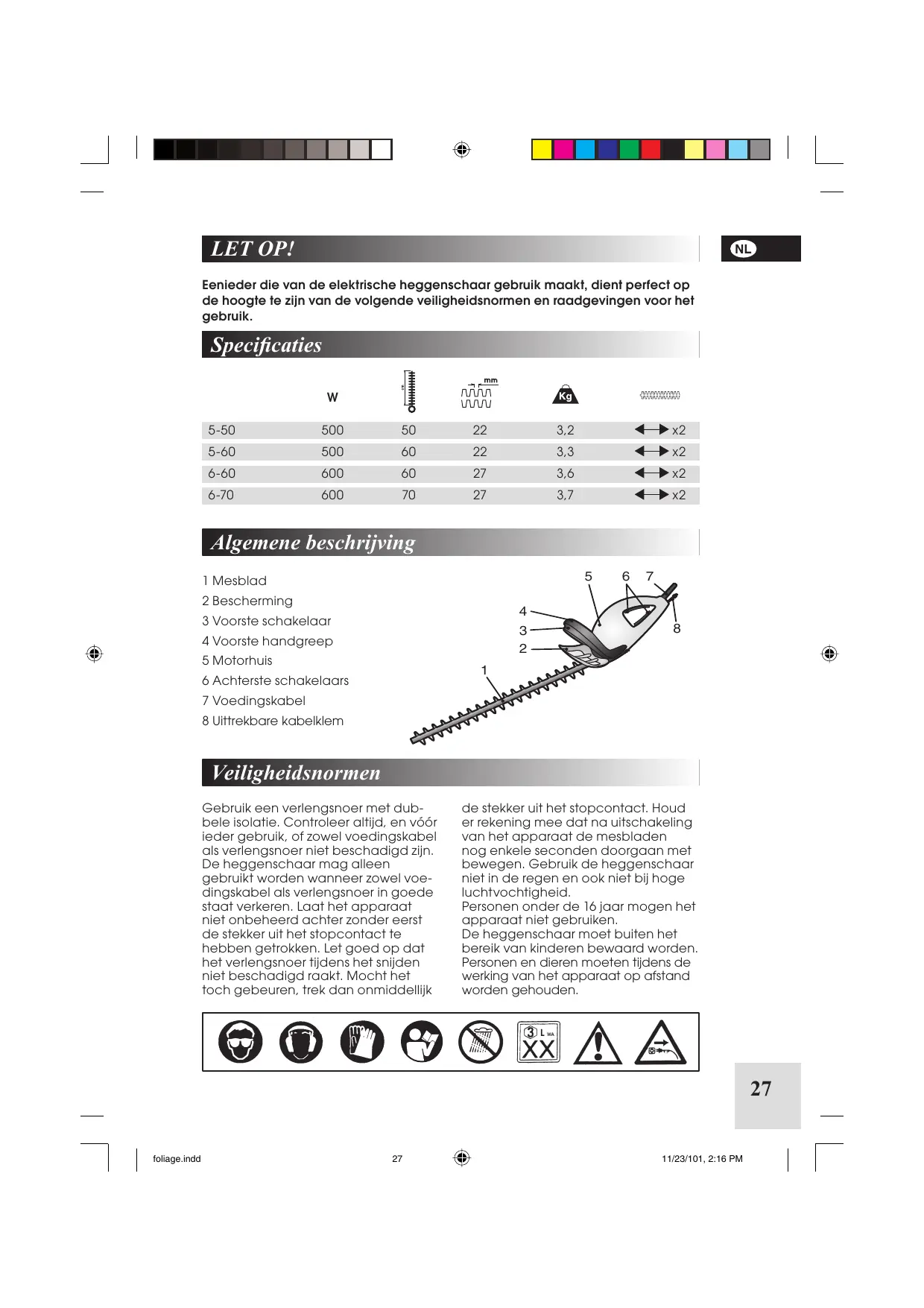 De heggenschaar要去 buren het bereik van kinderen bewaard worden. Personen en dieren要去 tijdens de werkking van het apparaat op afstand worden gezogen.