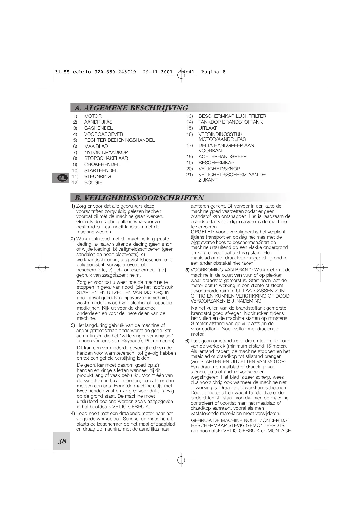 (zie hoofdstuk: VEILIG GEBRUIK en MONTAGE 31-55 cabrio 320-380-248729 29-11-2001 MAAIBLAD EN NYLON DRAADKOP). Schenk veel aandacht aan de veiligheidsvoorschriften daar bij niet opvolgen hiervan uw eigen leven of dat van anderen gevaar loopt door: a) mogelijk kontakt met maai-en/of zaagblad. b) wegslingerende voorwerpen. 14:41 Pagina 9 ATTENTIE: Start de machine nooit als de motor en de aandrijfas los van elkaar zijn. De koppeling kan dan uiteenspatten. Bij machines die van een koppeling voorzien zijn, moet men er zich van verzekeren dat het maai-onderdeel stil staat wanneer de motor op minimum draait.