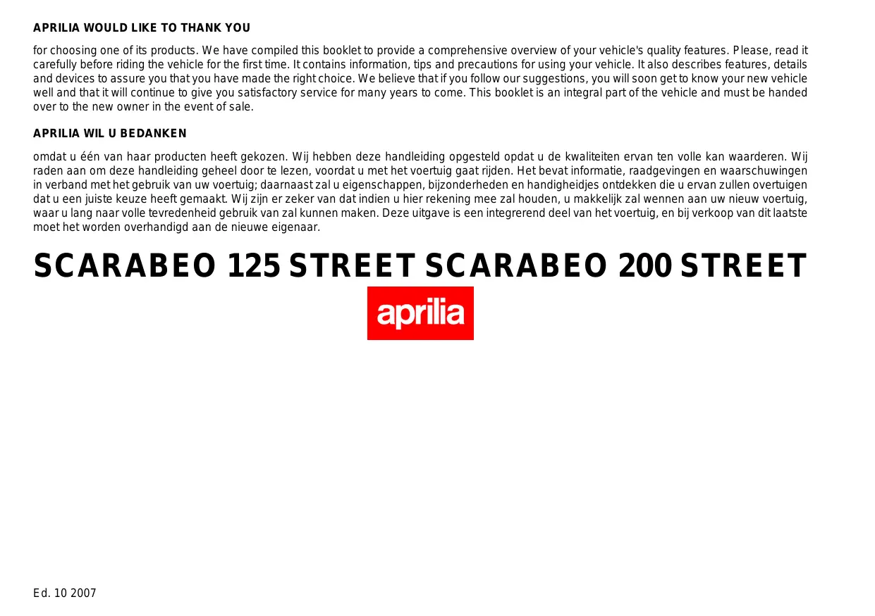 GEBRUIKSAANWIJZING SCARABEO STREET 125 STREET APRILIA