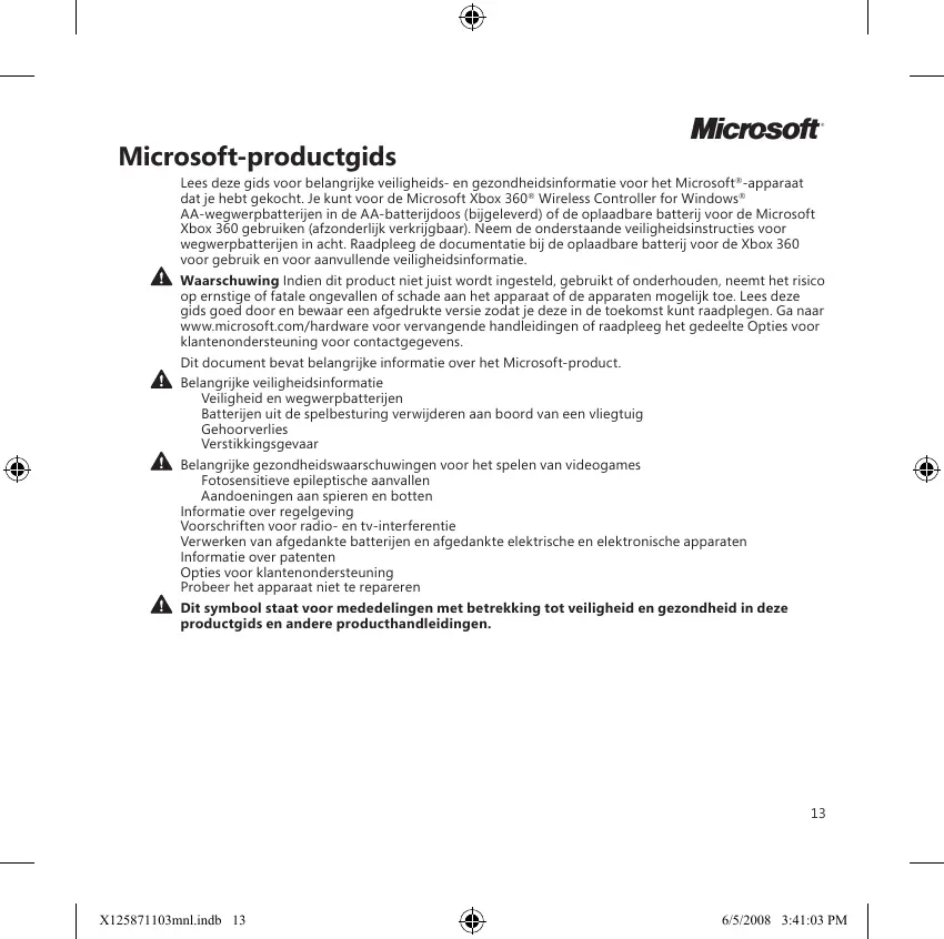 Microsoft Microsoft-productgids Lees deze gids voor belangrike veiligheids- en gezondheidsinformatie vor het Microsoft"-apparaat dat je hebt gekocht. Je kunt voor de Microsoft Xbox 360° Wireless Controller for Windows® Ah-wegwerpbatterien in de AA-batterijdoes (bijgeleverd) of de oplaadbare batterij voor de Microsoft Xbox 360 gebruiken (afzonderljk verkrifgbaar). Neem de onderstaande veiligheidsinstructies voor wegwerpbatterien in acht. Raadpleeg de documentatie bij de oplaadbare batteri vaor de Xbox 360 voor gebruik en voor sanvullende veiligheidsinformatie. À waarschuwing Indien dit product niet juist word ingesteld, gebruikt of onderhouden, neemt het risico ep ernstige of fatale ongevallen of schade aan het apparaat of de apparaten mogelik toe. Lees deze gids goed daor en bewaar een afgedrukte versie zodat je deze in de toekomst kunt raadplegen, Ga naar wvemicrosoft.com/hardware voor vervangende handieidingen of raadpleeg het gedeeite Opties voor Klantenondersteuning voor contactgegevens. Dit document bevat belangrike informatie over het Microsoft-product. À seianarike veiligheidsinformatie Velligheid en wegwerpbatterijen Batterien uit de spelbesturing verwijderen aan boord van een vliegtuig Gehogrverlies Verstikkingsgevaar À seiangrike gezondheïdswaarschuwingen voor het spelen van videogames Fotosensitieve epileptische aanvalien Aandoeningen aan spleren en botten Informatie over regelgeving Voarschriften veor radio- en tv-interferentie Verwerken van afgedankte batterijen en afgedankte elektrische en elektronische apparaten Informatie over patenten Opties voor klantenandersteuning Probeer het apparaat niet Le repareren À nit symbool staat voor mededeling productgids en andere produethandl igheid en gezondh FE) x Gamatnd 13 & sam sarl