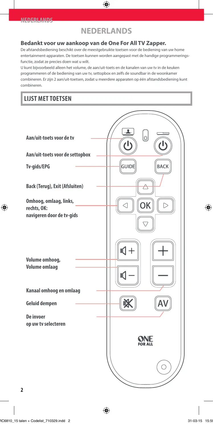 Download de handleiding voor uw Universele afstandsbediening in PDF-formaat gratis! Vind uw handleiding URC6810 - ONE FOR ALL en neem uw elektronisch apparaat weer in handen. Op deze pagina staan alle documenten die nodig zijn voor het gebruik van uw apparaat. URC6810 van het merk ONE FOR ALL.