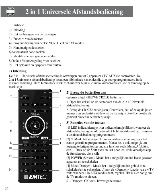 De 2 in 1 Universele afstandsbediening is ontworpen om tot 2 apparaten (TV, AUX) te controleren. De 2 in 1 Universele afstandsbediening bevat een bibliotheek van codes die zijn voorgeprogrammeerd in de afstandsbediening. Deze bibliotheek strekt zich uit over bijna alle audio videoproducten, die er vandaag op de markt zijn 1 2) Breng de batterijen aan 3 (gebruik altijd NIEUWE CR2032 batterijen)