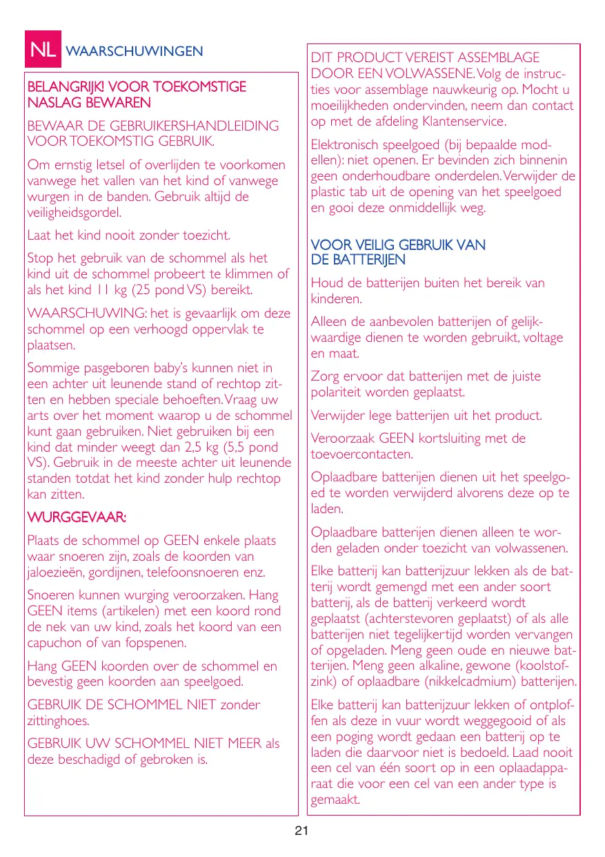 Les cordons présentent un risque de strangulation. Ne pas placer autour du cou de votre enfant des objets ayant des cordons, comme un capuchon ou une tétine. NE PAS laisser pendre de cordons au dessus de la balançoire ou attacher de cordons aux jouets.