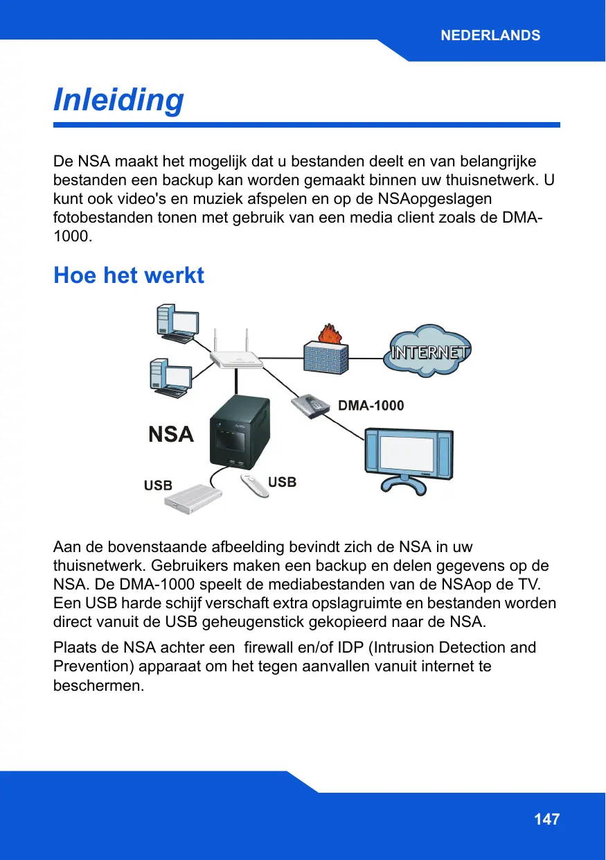 Aan de bovenstaande afbeelding bevindt zich de NSA in uw thuisnetwerk. Gebruikers maken een backup en delen gegevens op de NSA. De DMA-1000 speelt de mediabestanden van de NSAop de TV. Een USB harde schijf verschaft extra opslagruimte en bestanden worden direct vanuit de USB geheugenstick gekopieerd naar de NSA. Plaats de NSA achter een firewall en/of IDP (Intrusion Detection and Prevention) apparaat om het tegen aanvallen vanuit internet te beschermen.
