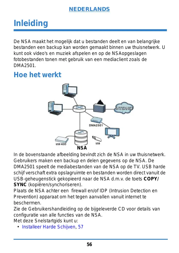 NSA In de bovenstaande afbeelding bevindt zich de NSA in uw thuisnetwerk. Gebruikers maken een backup en delen gegevens op de NSA. De DMA2501 speelt de mediabestanden van de NSA op de TV. USB harde schijf verschaft extra opslagruimte en bestanden worden direct vanuit de USB-geheugenstick gekopieerd naar de NSA d.m.v. de toets COPY/ SYNC (kopiëren/synchoriseren). Plaats de NSA achter een firewall en/of IDP (Intrusion Detection en Prevention) apparaat om het tegen aanvallen vanuit internet te beschermen. Zie de Gebruikershandleiding op de bijgeleverde CD voor details van configuratie van alle functies van de NSA. Met deze Snelstartgids kunt u: • Installeer Harde Schijven, 57
