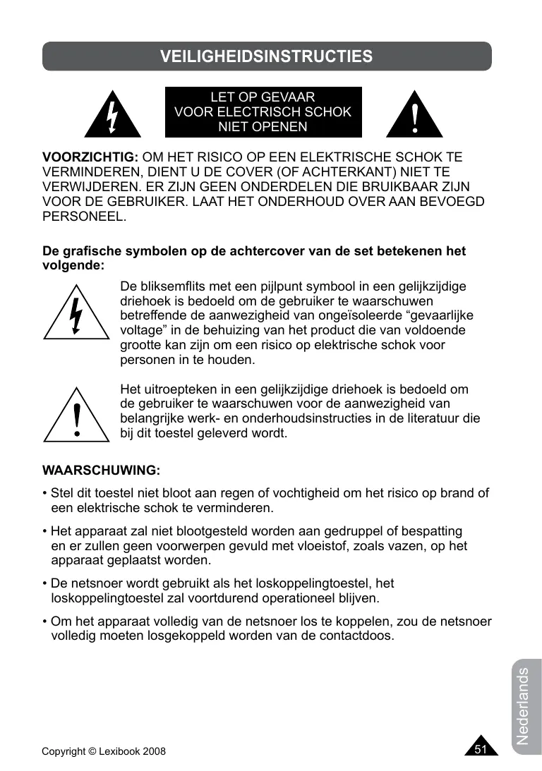 De bliksemflits met een pijlpunt symbool in een gelijkzijdige driehoek is bedoeld om de gebruiker te waarschuwen betreffende de aanwezigheid van ongeïsoleerde "gevaarlijke voltage" in de behuizing van het product die van voldoende grootte kan zijn om een risico op elektrische schok voor Personen in te houden.