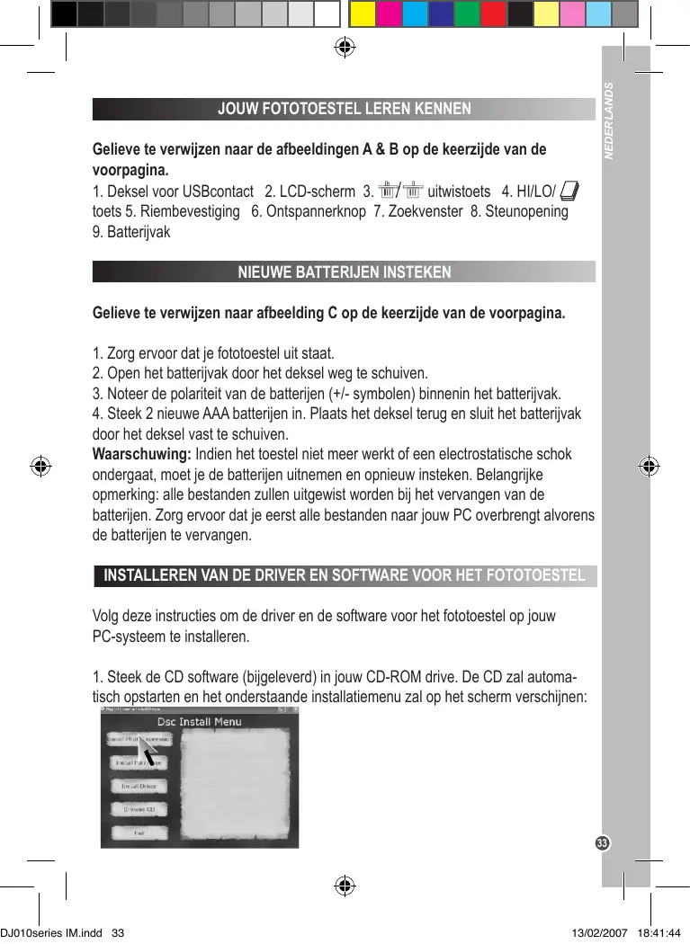 door het deksel vast te schuiven. Waarschuwing: Indien het toestel niet meer werkt of een electrostatische schok ondergaat, moet je de batterijen uitnemen en opnieuw insteken. Belangrijke opmerking: alle bestanden zullen uitgewist worden bij het vervangen van de batterijen. Zorg ervoor dat je eerst alle bestanden naar jouw PC overbrengt alvorens de batterijen te vervangen. INSTALLEREN VAN DE DRIVER EN SOFTWARE VOOR HET FOTOTOESTEL Volg deze instructies om de driver en de software voor het fototoestel op jouw PC-systeem te installeren. 1. Steek de CD software (bijgeleverd) in jouw CD-ROM drive. De CD zal automatisch opstarten en het onderstaande installatiemenu zal op het scherm verschijnen: DJ010series IM.indd 33