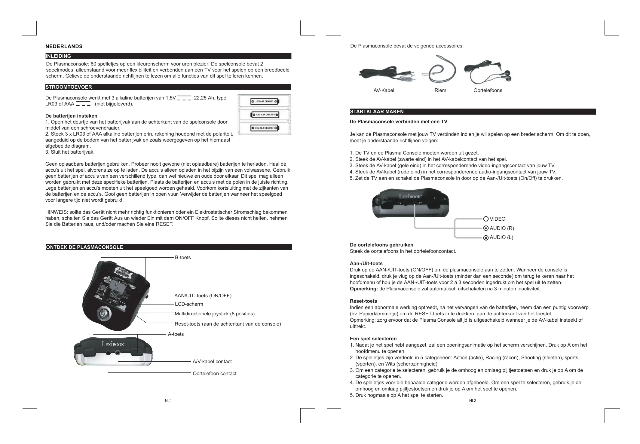 De Plasmaconsole: 60 spelletjes op een kleurenschemr voor uren plezier! De spelconsole bevat 2 spelelmodes: alleenstaand voor meer flexibiliteit en verbonden aan een TV voor het speloen op een breedbeeld scherm. Gelieve de onderstaande richtlijnen te lezen om alle functies van dit spel te leren kennen.