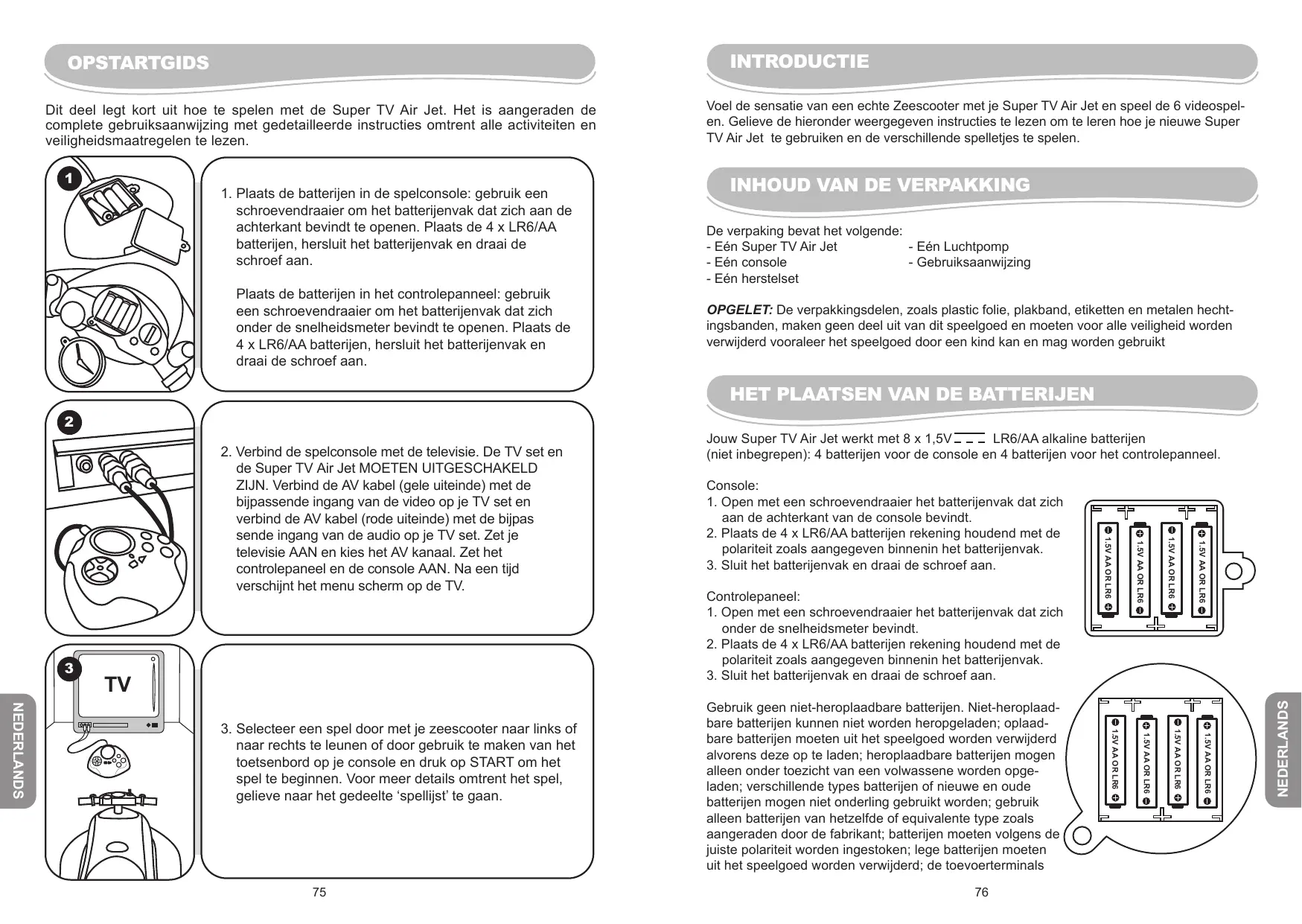 Jouw Super TV Air Jet werkt met 8 x 1,5V LR6/AA alkaline batterijen (niet inbegrepen): 4 batterijen voor de console en 4 batterijen voor het controlepanneel. 1.5V AA OR LR6