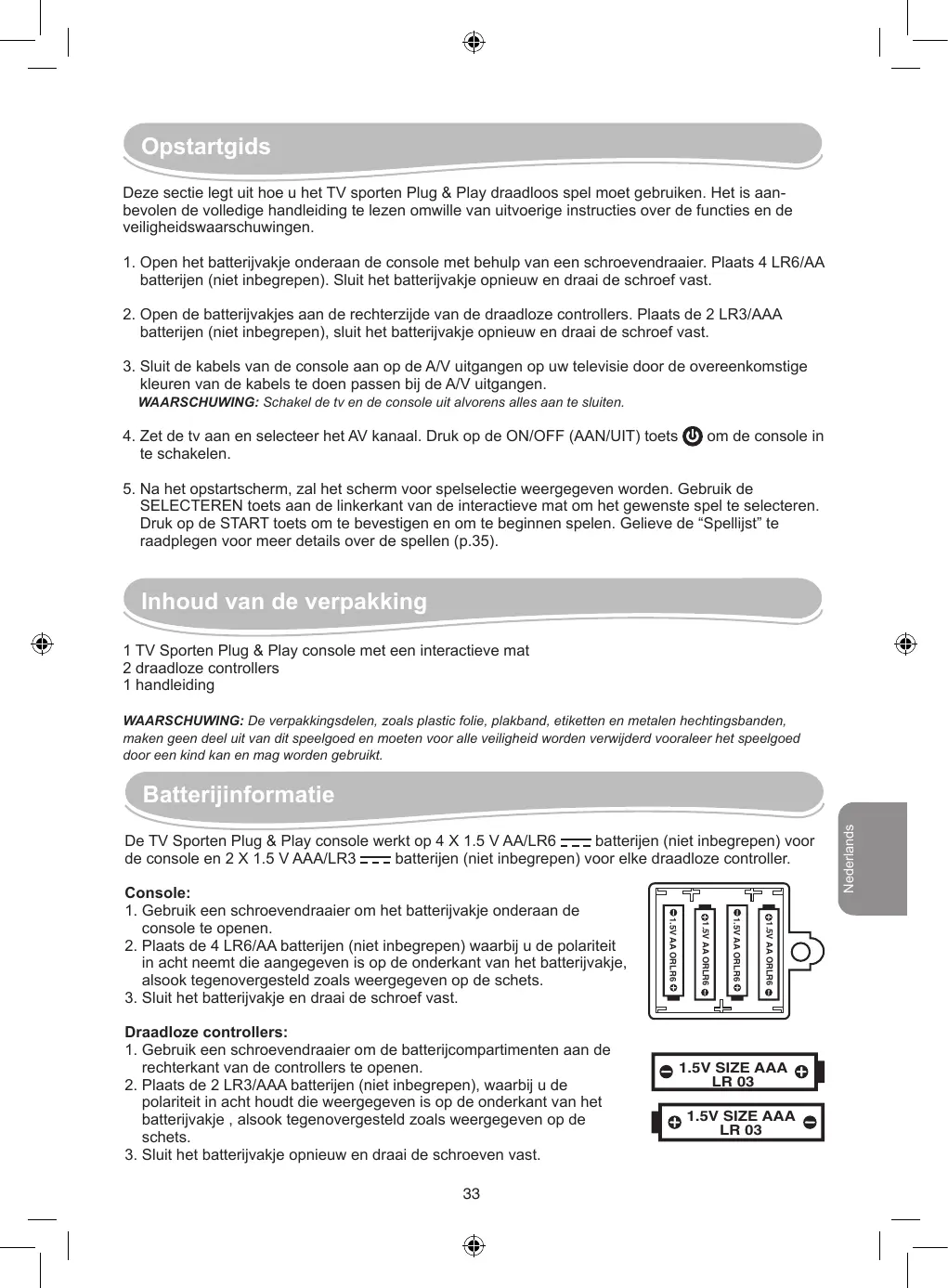 SELECTEREN toets aan de linkerkant van de interactieve mat om het gewenste spel te selecteren. Druk op de START toets om te bevestigen en om te beginnen spelen. Gelieve de “Spellijst” te raadplegen voor meer details over de spellen (p.35). Inhoud van de verpakking 1 TV Sporten Plug & Play console met een interactieve mat 2 draadloze controllers 1 handleiding WAARSCHUWING: De verpakkingsdelen, zoals plastic folie, plakband, etiketten en metalen hechtingsbanden, maken geen deel uit van dit speelgoed en moeten voor alle veiligheid worden verwijderd vooraleer het speelgoed door een kind kan en mag worden gebruikt. De TV Sporten Plug & Play console werkt op 4 X 1.5 V AA/LR6 batterijen (niet inbegrepen) voor de console en 2 X 1.5 V AAA/LR3 batterijen (niet inbegrepen) voor elke draadloze controller.