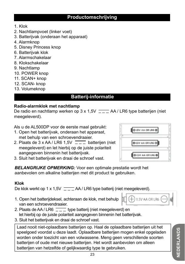 Batterij-informatie Radio-alarmklok met nachtlamp De radio en nachtlamp werken op 3 x 1,5V meegeleverd). AA / LR6 type batterijen (niet Als u de AL500DP voor de eerste maal gebruikt: