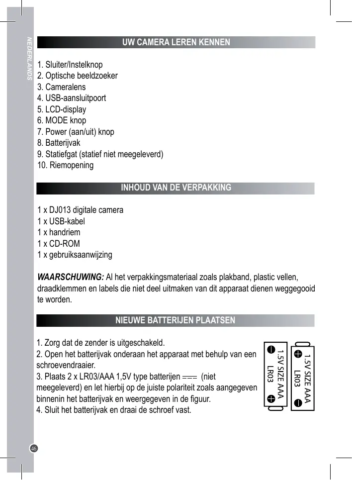 1 x DJ013 digitale camera 1 x USB-kabel 1 x handriem 1 x CD-ROM 1 x gebruiksaanwijzing WAARSCHUWING: Al het verpakkingsmateriaal zoals plakband, plastic vellen, draadklemmen en labels die niet deel uitmaken van dit apparaat dienen weggegooid te worden.