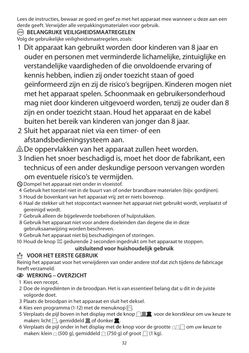 1 Dit apparaat kan gebruikt worden door kinderen van 8 jaar en ouder en personen met verminderde lichamelijke, zintuiglijke en verstandelijke vaardigheden of die onvoldoende ervaring of kennis hebben, indien zij onder toezicht staan of goed geïnformeerd zijn en zij de risico’s begrijpen. Kinderen mogen niet met het apparaat spelen. Schoonmaak en gebruikersonderhoud mag niet door kinderen uitgevoerd worden, tenzij ze ouder dan 8 zijn en onder toezicht staan. Houd het apparaat en de kabel buiten het bereik van kinderen van jonger dan 8 jaar. 2 Sluit het apparaat niet via een timer- of een afstandsbedieningsysteem aan. ¬ De oppervlakken van het apparaat zullen heet worden. 3 Indien het snoer beschadigd is, moet het door de fabrikant, een technicus of een ander deskundige persoon vervangen worden om eventuele risico’s te vermijden.