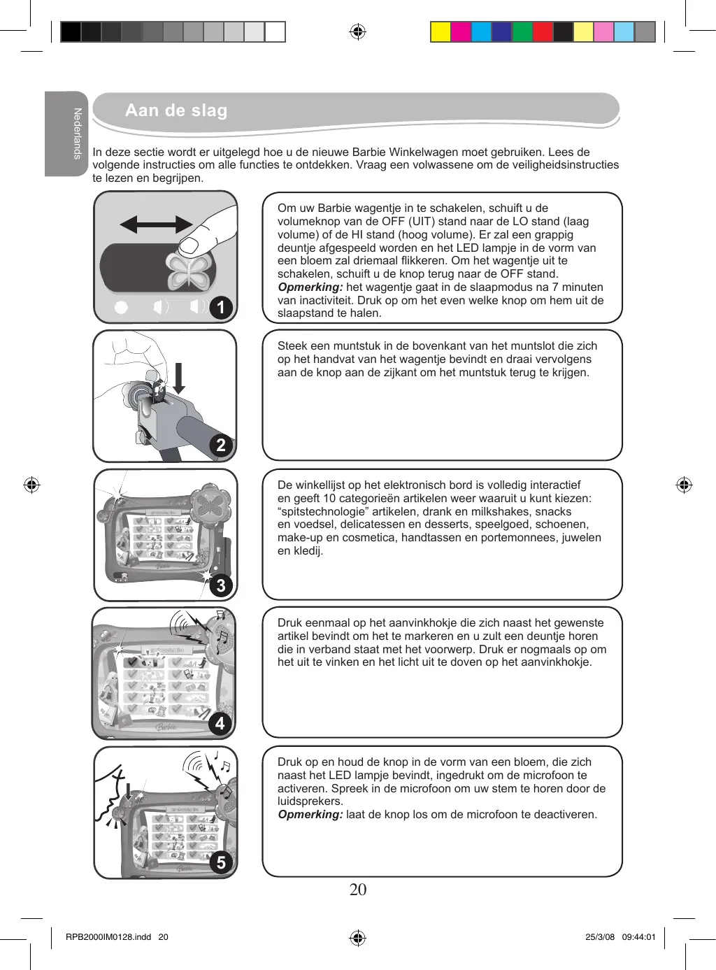 RPB2000IM0128.indd 19 25/3/08 09:43:57 Nederlands Aan de slag In deze sectie wordt er uitgelegd hoe u de nieuwe Barbie Winkelwagen moet gebruiken. Lees de volgende instructies om alle functies te ontdekken. Vraag een volwassene om de veiligheidsinstructies te lezen en begrijpen.