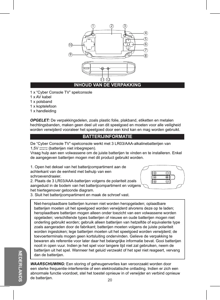 OPGELET: De verpakkingsdelen, zoals plastic folie, plakband, etiketten en metalen hechtingsbanden, maken geen deel uit van dit speelgoed en moeten voor alle veiligheid worden verwijderd vooraleer het speelgoed door een kind 9 kan en mag worden gebruikt. BATTERIJINFORMATIE De “Cyber Console TV”-spelconsole werkt met 3 LR03/AAA-alkalinebatterijen van 1,5V (batterijen niet inbegrepen). Vraag hulp aan een volwassene om de juiste batterijen te vinden en te installeren. Enkel de aangegeven batterijen mogen met dit product gebruikt worden.