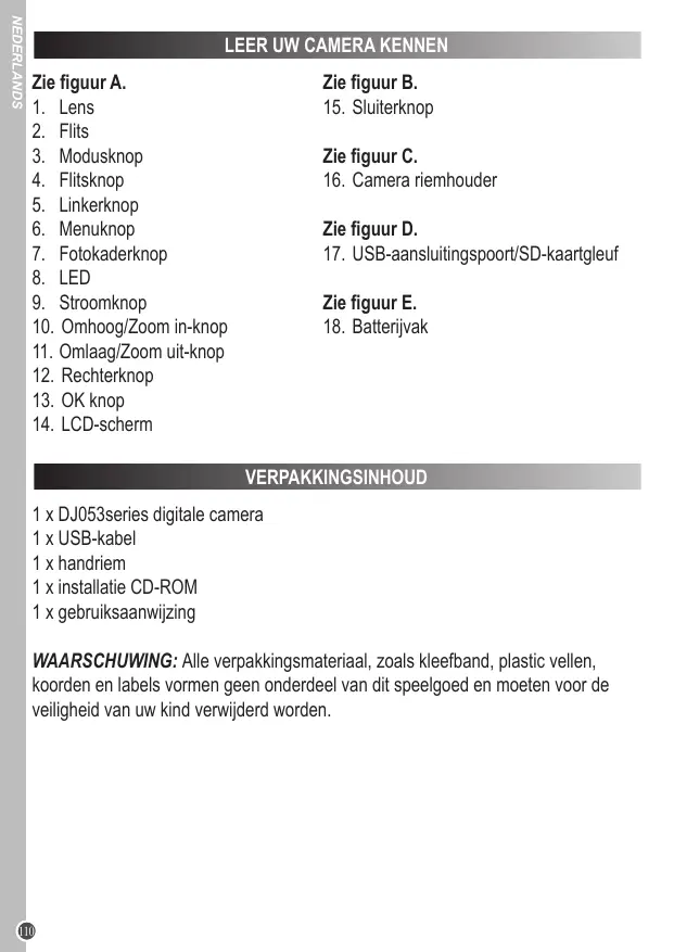 WAARSCHUWING: Alle verpakkingsmaterial, zoals kleefband, plastic vellen, koorden en labels vormen geen onderdeel van dit spellegoed en要去en voor deeiligheid van uw kind verwijderd worden.