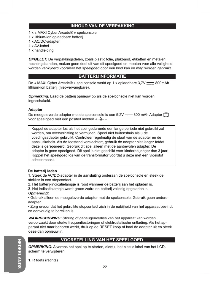 1 x « MAXI Cyber Arcade® » spelconsole 1 x lithium-ion oplaadbare batterij 1 x AC/DC-adapter 1 x AV-kabel 1 x handleiding OPGELET: De verpakkingsdelen, zoals plastic folie, plakband, etiketten en metalen hechtingsbanden, maken geen deel uit van dit speelgoed en moeten voor alle veiligheid worden verwijderd vooraleer het speelgoed door een kind kan en mag worden gebruikt. BATTERIJINFORMATIE De « MAXI Cyber Arcade® » spelconsole werkt op 1 x oplaadbare 3,7V lithium-ion batterij (niet-vervangbare). 800mAh Opmerking: Laad de batterij opnieuw op als de spelconsole niet kan worden ingeschakeld. Adapter De meegeleverde adapter met de spelconsole is een 5,2V voor speelgoed met een positief midden