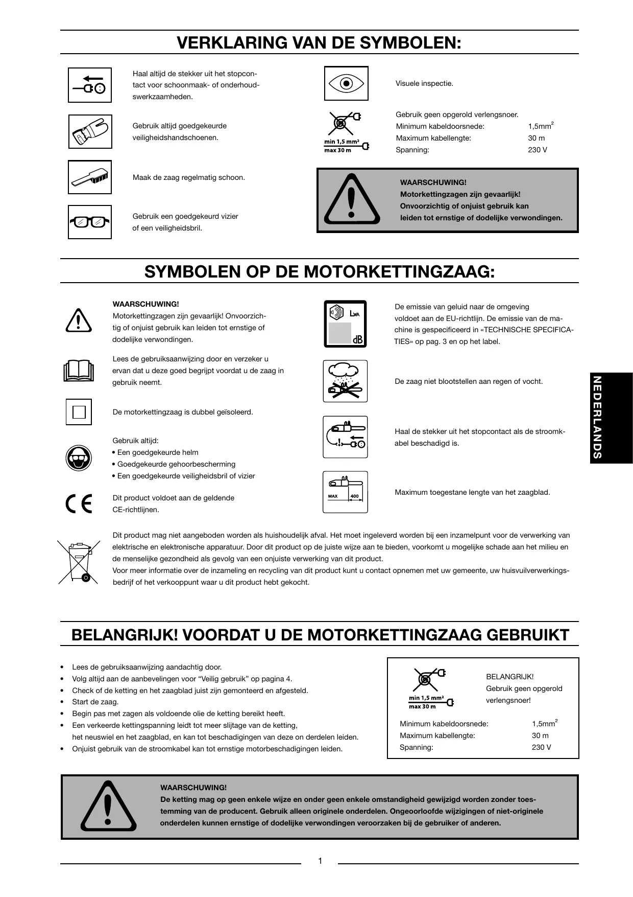 ! AVANT TOUTE UTILISATION DE LA TRONÇONNEUSE, page 1.