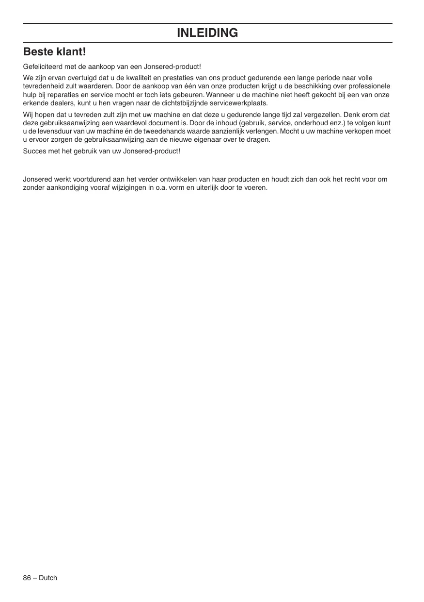 Dutch – 85 INLEIDING Beste klant! Gefeliciteerd met de aankoop van een Jonsered-product! We zijn ervan overtuigd dat u de kwaliteit en prestaties van ons product gedurende een lange periode naar volle tevredenheid zult waarderen. Door de aankoop van één van onze producten krijgt u de beschikking over professionele hulp bij reparaties en service mocht er toch iets gebeuren. Wanneer u de machine niet heeft gekocht bij een van onze erkende dealers, kunt u hen vragen naar de dichtstbijzijnde servicewerkplaats. Wij hopen dat u tevreden zult zijn met uw machine en dat deze u gedurende lange tijd zal vergezellen. Denk erom dat deze gebruiksaanwijzing een waardevol document is. Door de inhoud (gebruik, service, onderhoud enz.) te volgen kunt u de levensduur van uw machine én de tweedehands waarde aanzienlijk verlengen. Mocht u uw machine verkopen moet u ervoor zorgen de gebruiksaanwijzing aan de nieuwe eigenaar over te dragen. Succes met het gebruik van uw Jonsered-product! Jonsered werkt voortdurend aan het verder ontwikkelen van haar producten en houdt zich dan ook het recht voor om zonder aankondiging vooraf wijzigingen in o.a. vorm en uiterlijk door te voeren. 86 – Dutch WAT IS WAT? Wat is wat op de motorkettingzaag?