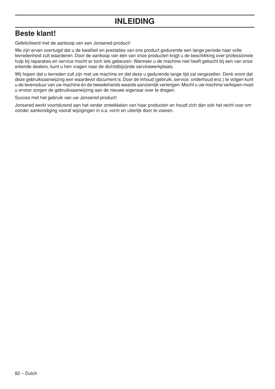 Dutch – 81 INLEIDING Beste klant! Gefeliciteerd met de aankoop van een Jonsered-product! We zijn ervan overtuigd dat u de kwaliteit en prestaties van ons product gedurende een lange periode naar volle tevredenheid zult waarderen. Door de aankoop van één van onze producten krijgt u de beschikking over professionele hulp bij reparaties en service mocht er toch iets gebeuren. Wanneer u de machine niet heeft gekocht bij een van onze erkende dealers, kunt u hen vragen naar de dichtstbijzijnde servicewerkplaats. Wij hopen dat u tevreden zult zijn met uw machine en dat deze u gedurende lange tijd zal vergezellen. Denk erom dat deze gebruiksaanwijzing een waardevol document is. Door de inhoud (gebruik, service, onderhoud enz.) te volgen kunt u de levensduur van uw machine én de tweedehands waarde aanzienlijk verlengen. Mocht u uw machine verkopen moet u ervoor zorgen de gebruiksaanwijzing aan de nieuwe eigenaar over te dragen. Succes met het gebruik van uw Jonsered-product! Jonsered werkt voortdurend aan het verder ontwikkelen van haar producten en houdt zich dan ook het recht voor om zonder aankondiging vooraf wijzigingen in o.a. vorm en uiterlijk door te voeren. 82 – Dutch WAT IS WAT?