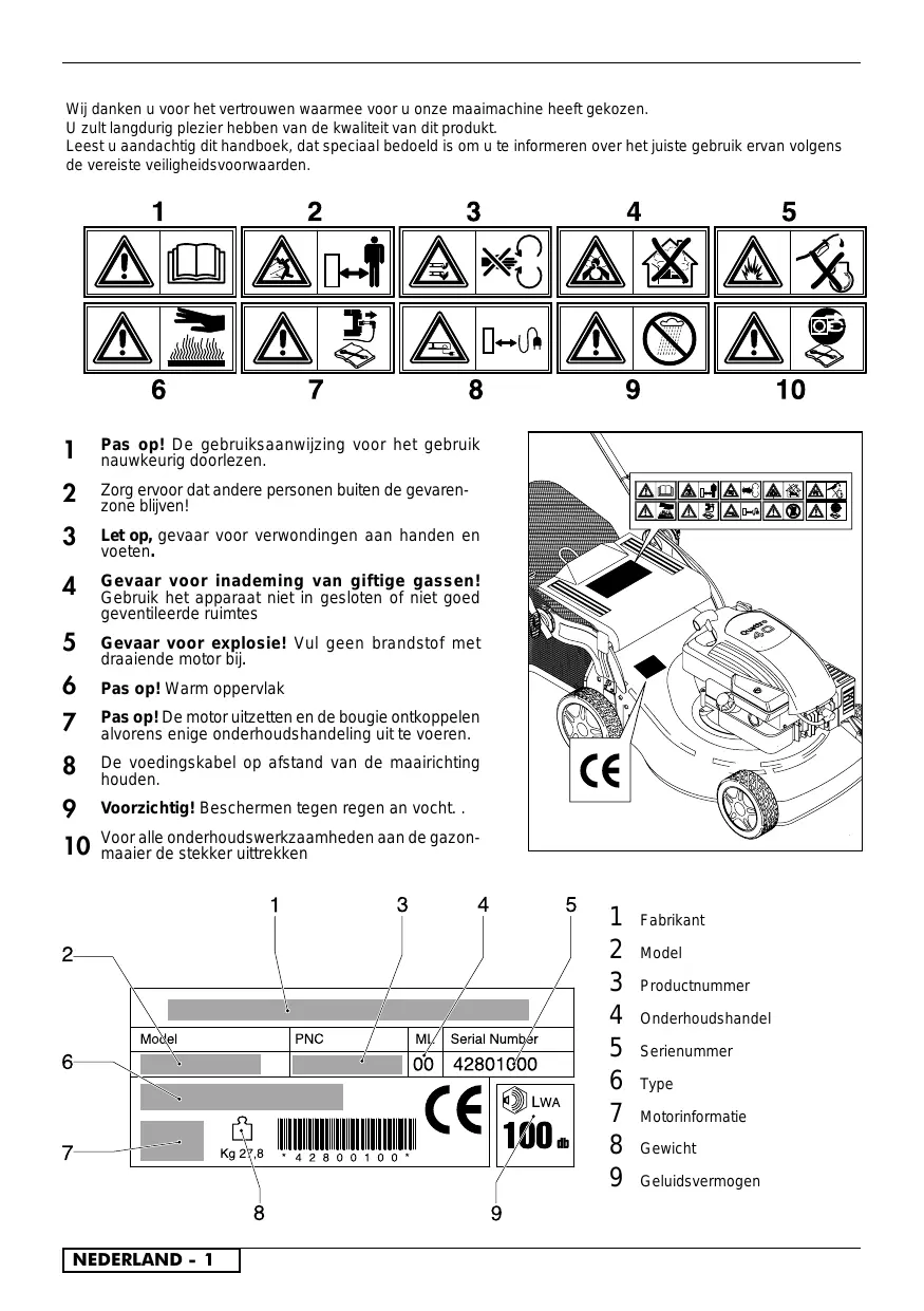 Deze handleiding is samengesteld voor het gebruik van verschillende modellen grasmaaimachines van verschillende afmetingen en met verschillende accessoires. Danger d’inhalation de gaz toxiques! Ne pas utiliser l’appareil dans des espaces fermés ou peu ventilés. Danger d’explosion! Ne pas faire le plein de carburant, moteur en marche. Attention! Surface chaude Attention! Eteindre le moteur et enlever la bougie avant d’effectuer quelque opération d’entretien que ce soit. Ecarter le câble d’alimentation de l’outil tranchant.