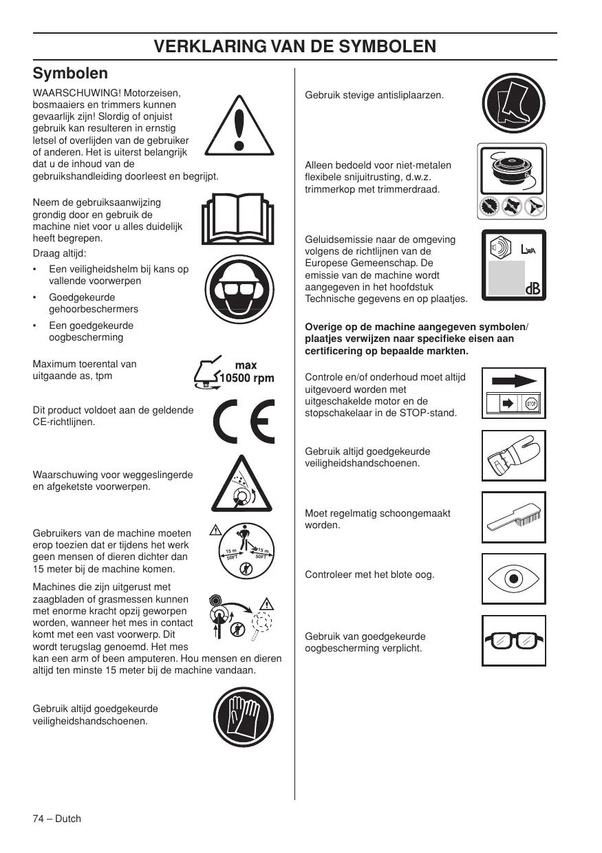 Een goedgekeurde oogbescherming Geluidsemissie naar de omgeving volgens de richtlijnen van de Europese Gemeenschap. De emissie van de machine wordt aangegeven in het hoofdstuk Technische gegevens en op plaatjes. Overige op de machine aangegeven symbolen/ plaatjes verwijzen naar specifieke eisen aan certificering op bepaalde markten. Maximum toerental van uitgaande as, tpm Controle en/of onderhoud moet altijd uitgevoerd worden met uitgeschakelde motor en de stopschakelaar in de STOP-stand. Dit product voldoet aan de geldende CE-richtlijnen. Gebruik altijd goedgekeurde veiligheidshandschoenen. Waarschuwing voor weggeslingerde en afgeketste voorwerpen. Gebruikers van de machine moeten erop toezien dat er tijdens het werk geen mensen of dieren dichter dan 15 meter bij de machine komen. Moet regelmatig schoongemaakt worden. 15 m 50FT 15 m 50FT Machines die zijn uitgerust met zaagbladen of grasmessen kunnen met enorme kracht opzij geworpen worden, wanneer het mes in contact komt met een vast voorwerp. Dit wordt terugslag genoemd. Het mes kan een arm of been amputeren. Hou mensen en dieren altijd ten minste 15 meter bij de machine vandaan. Gebruik altijd goedgekeurde veiligheidshandschoenen. 74 – Dutch Controleer met het blote oog. Gebruik van goedgekeurde oogbescherming verplicht. INHOUD Inhoud
