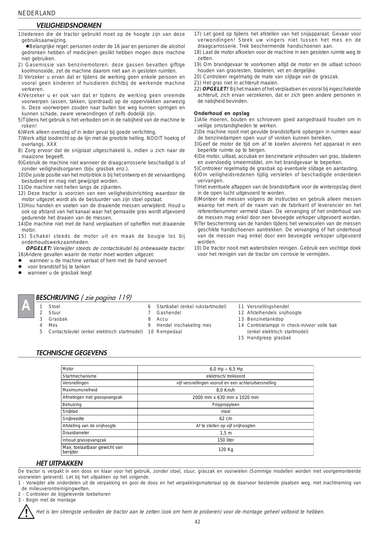 - Pas op! De gebruiksaanwijzing voor het gebruik nauwkeurig doorlezen. 3) Pendant le fonctionnement de la machine, veuillez vous assurer qu’aucune personne, surtout enfants ou animaux domestiques ne se trouvent à proximité de la machine. 4)Veuillez vous assurer que pendant le fonctionnement de la machine aucun corps étranger ne se trouve dans le gazon. Un objet laissé dans le gazon pendant le fonctionnement pourrait être lancé tout autour par la machine et causer des dommages, lésions graves ou même être mortel. 5) Pendant l’emploi il est interdit de fumer à proximité de la machine. 6) Tondre uniquement à la lumière du jour ou de toute façon en conditions de bon éclairage. 7)Tondre uniquement en haut et en bas sur une pente, JAMAIS à angle ou transversalement par rapport à la pente même. 8)En se rapprochant de la zone à tondre, vérifier que le plat de coupe n’est pas enclenché. 9) N’utiliser jamais la machine si le carter est endommagé ou en absence des dispositifs de sécurité (sac de ramassage, etc.). 10) Le positionnement correct du bloc moteur a été expressément projeté et prédisposé en usine et ne doit pas être modifié. 11)Ne pas incliner la machine sur les côtés. 12) Cette machine est munie d’un dispositif de sécurité qui arrête le moteur chaque fois que l’opérateur se lève du siège. 13) Tenir les mains et les pieds loin des lames en rotation. Se tenir aussi loin de l’ouverture de déchargement de l’herbe coupée pendant la rotation des lames. 14)Ne pas déplacer ou soulever à la main la machine avec moteur en fonction. 15)En cas d’entretien de la machine, arrêter toujours le moteur et débrancher la bougie. Important : Enlever la clé de contact chaque fois que l’opérateur laisse la tondeuse non gardée. 16)Le moteur doit également être arrêté dans les cas suivants: l vous vous éloignez de la machine ou pendant son transport l avant le remplissage de carburant l pendant les opérations de vidage du sac de ramassage.