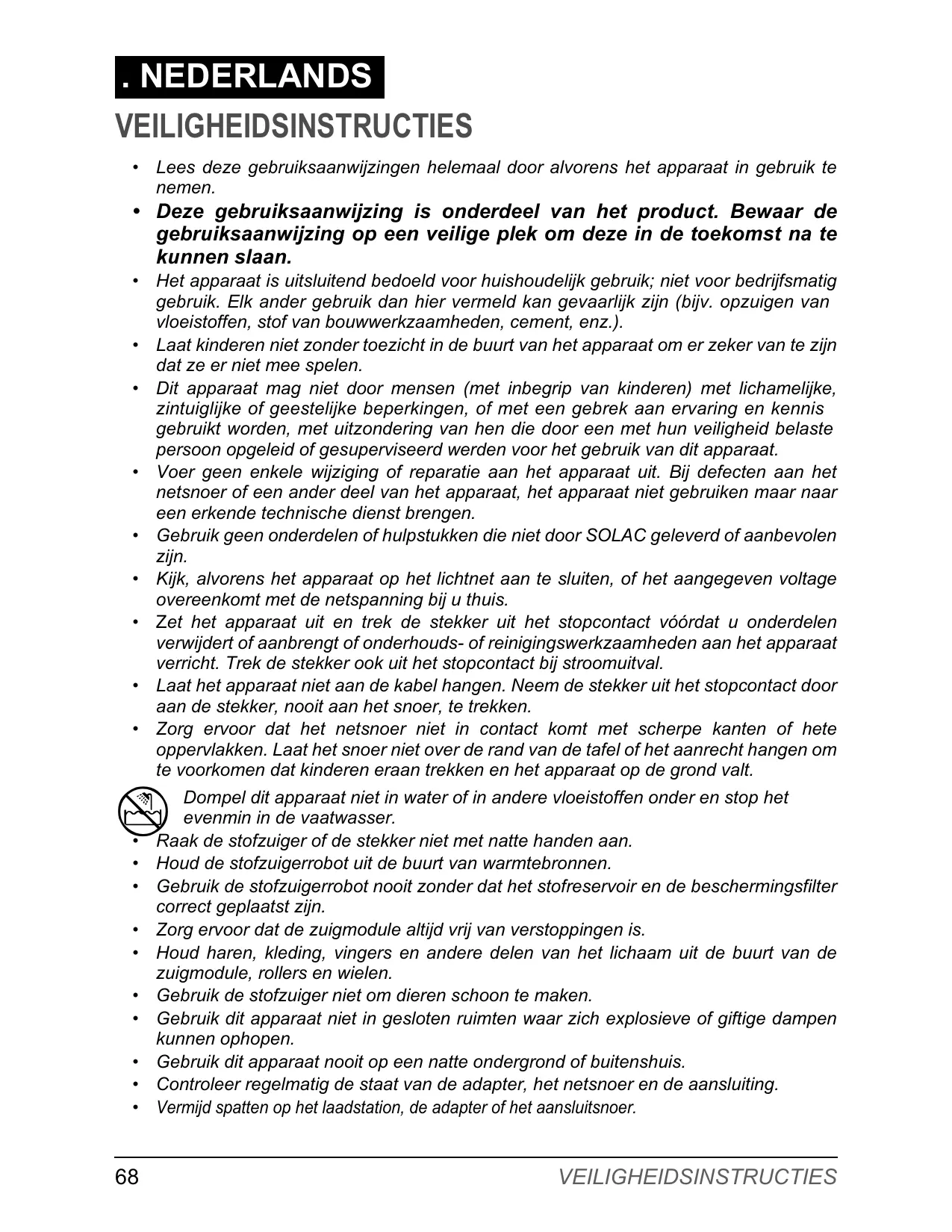Dompel dit apparaat niet in water of in andere vloeistoffen onder en stop het evenmin in de vaatwasser. Raak de stofzuiger of de stekker niet met natte handen aan. Houd de stofzuigerrobot uit de buurt van warmtebronnen. Gebruik de stofzuigerrobot nooit zonder dat het stofreservoir en de beschermingsfilter correct geplaatst zijn. Zorg ervoor dat de zuigmodule altijd vrij van verstoppingen is. Houd haren, kleding, vingers en andere delen van het lichaam uit de buurt van de zuigmodule, rollers en wielen. Gebruik de stofzuiger niet om dieren schoon te maken. Gebruik dit apparaat niet in gesloten ruimten waar zich explosieve of giftige dampen kunnen ophopen. Gebruik dit apparaat nooit op een natte ondergrond of buitenshuis. Controleer regelmatig de staat van de adapter, het netsnoer en de aansluiting. Vermijd spatten op het laadstation, de adapter of het aansluitsnoer.