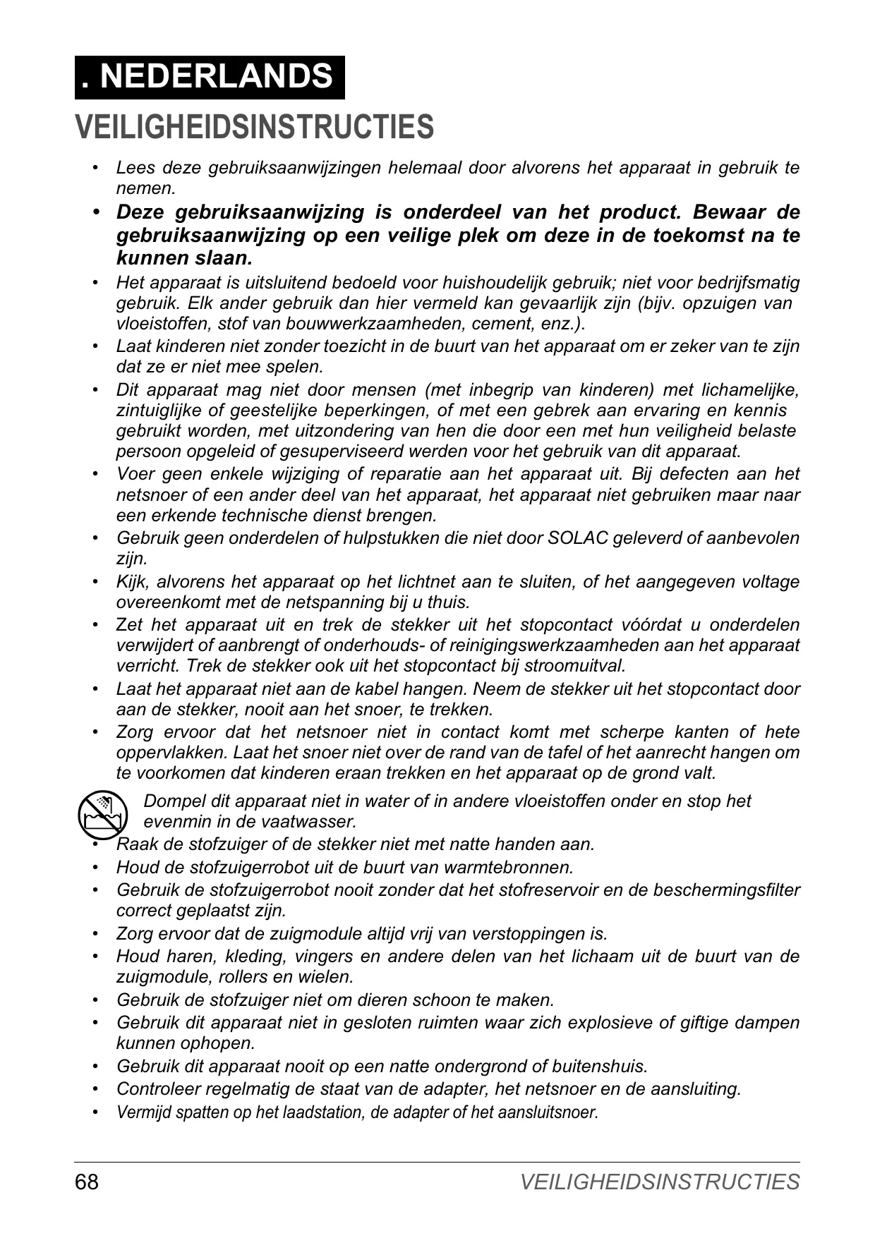 Dompel dit apparaat niet in water of in andere vloeistoffen onder en stop het evenmin in de vaatwasser. Raak de stofzuiger of de stekker niet met natte handen aan. Houd de stofzuigerrobot uit de buurt van warmtebronnen. Gebruik de stofzuigerrobot nooit zonder dat het stofreservoir en de beschermingsfilter correct geplaatst zijn. Zorg ervoor dat de zuigmodule altijd vrij van verstoppingen is. Houd haren, kleding, vingers en andere delen van het lichaam uit de buurt van de zuigmodule, rollers en wielen. Gebruik de stofzuiger niet om dieren schoon te maken. Gebruik dit apparaat niet in gesloten ruimten waar zich explosieve of giftige dampen kunnen ophopen. Gebruik dit apparaat nooit op een natte ondergrond of buitenshuis. Controleer regelmatig de staat van de adapter, het netsnoer en de aansluiting. Vermijd spatten op het laadstation, de adapter of het aansluitsnoer.