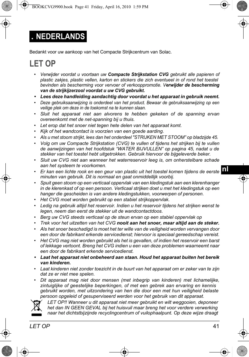 BOOKCVG9900.book Page 41 Friday, April 16, 2010 1:59 PM . NEDERLANDS Bedankt voor uw aankoop van het Compacte Strijkcentrum van Solac. LET OP