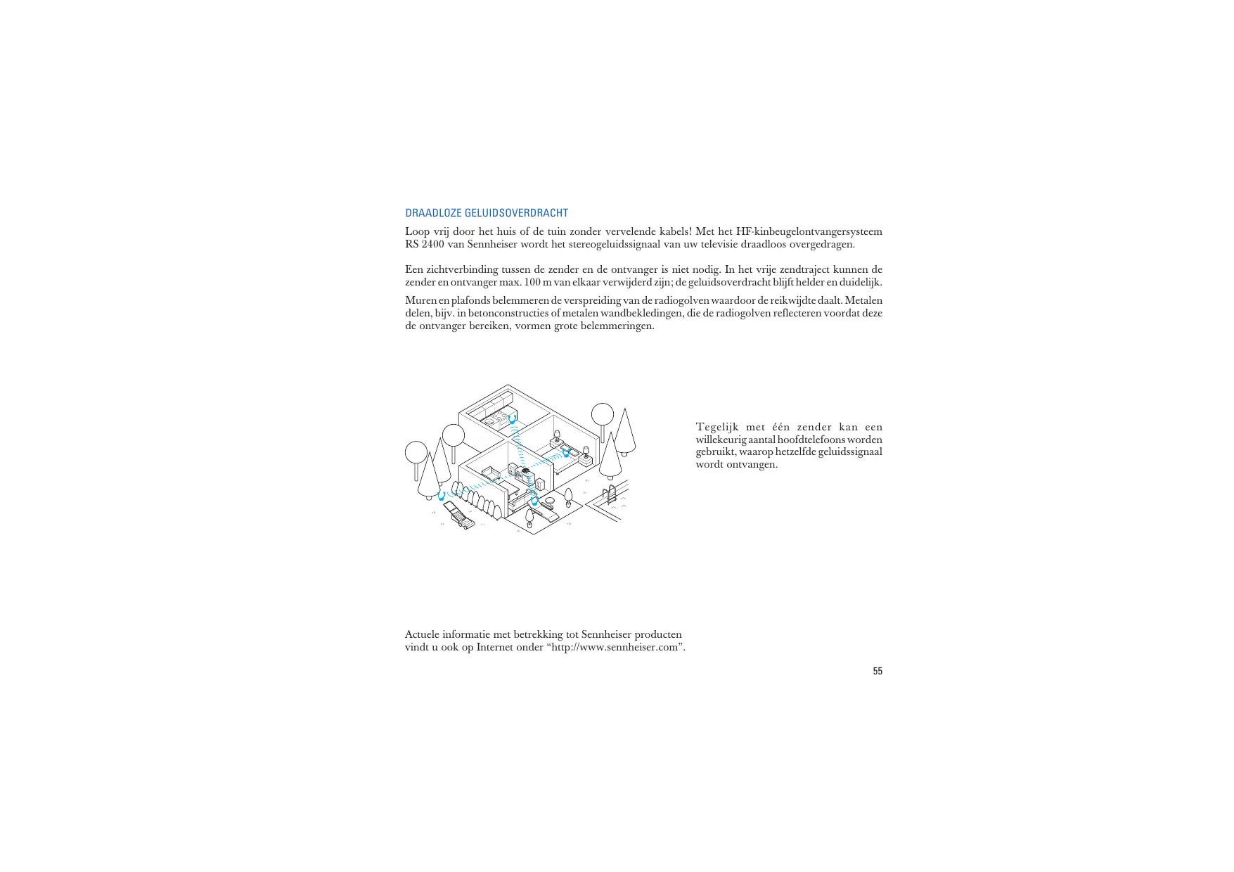 DRAADLOZE GELUIDSOVERDRACHT Loop vrij door het huis of de tuin zonder vervelende kabels! Met het HF-kinbeugelontvangersysteem RS 2400 van Sennheiser wordt het stereogeluidssignaal van uw televisie draadloos overgedragen. Een zichtverbinding tussen de zender en de ontvanger is niet nodig. In het vrije zendtraject kunnen de zender en ontvanger max. 100 m van elkaar verwijderd zijn; de geluidsoverdracht blijft helder en duidelijk. Muren en plafonds belemmeren de verspreiding van de radiogolven waardoor de reikwijdte daalt. Metalen delen, bijv. in betonconstructies of metalen wandbekledingen, die de radiogolven reflecteren voordat deze de ontvanger bereiken, vormen grote belemmeringen. Tegelijk met één zender kan een willekeurig aantal hoofdtelefoons worden gebruikt, waarop hetzelfde geluidssignaal wordt ontvangen. Actuele informatie met betrekking tot Sennheiser producten vindt u ook op Internet onder “http://www.sennheiser.com”.