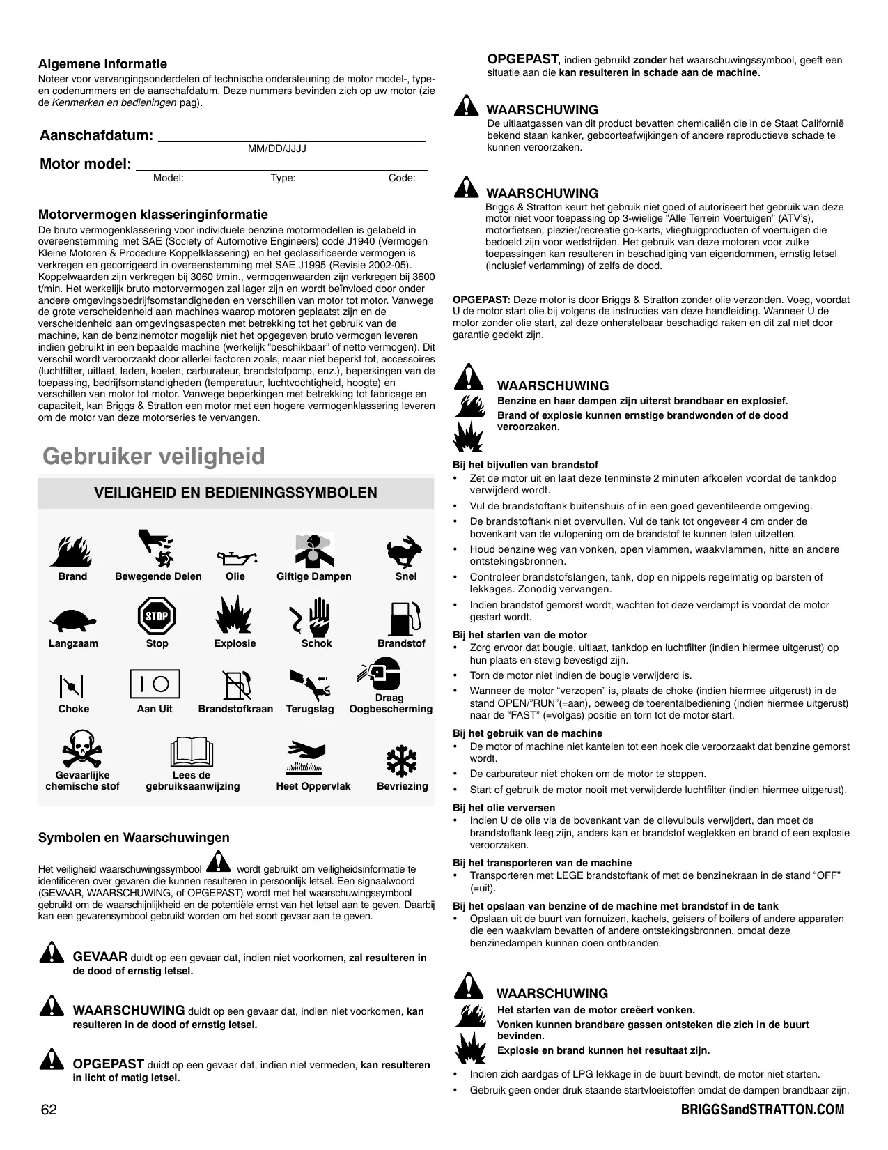 Algemene informatie Noteer voor vervangingsonderdelen of technische ondersteuning de motor model. type- en codenummers en de aanschafdatum. Deze nummers bevinden zich op uw motor (zie de Kenmerken en bedieningen pag). Aanschafdatum: MM/DDAJJJ Motor model: Model: Type Code: Motorvermogen klasseringinformatie De bruto vermogenklassering voor individuele benzine motormodellen is gelabeld in overeenstemming met SAE (Society of Automotive Engineers) code J1940 (Vermogen Kieine Motoren & Procedure Koppelklassering) en het geclassificeerde vermogen is verkregen en gecorrigeerd in overeenstemming met SAE J1995 (Revisie 2002-05). Koppelwaarden zijn verkregen bij 3060 t/min., vermogenwaarden zijn verkregen bij 3600 min. Het werkelik bruto motorvermogen zal lager zin en wordt beïnvloed door onder andere omgevingsbedrijfsomstandigheden en verschillen van motor tot motor. Vanwege de grote verscheidenheid aan machines waarop motoren geplaatst zijn en de verscheidenheïd aan omgevingsaspecten met betrekking tot het gebruik van de machine, kan de benzinemotor mogelik niet het opgegeven bruto vermogen leveren indien gebruikt in een bepaalde machine (werkelik “beschikbaar” of netto vermogen). Dit verschil wordt veroorzaakt door allerlei factoren zoals, maar niet beperkt tot, accessoires luchtflter, uitlaat, laden, koelen, carburateur, brandstofpomp, enz.), beperkingen van de toepassing, bedrifsomstandigheden (temperatuur, luchtvochtigheid, hoogte) en verschillen van motor tot motor. Vanwege beperkingen met betrekking tot fabricage en capaciteit, kan Briggs & Stratton een motor met een hogere vermogenklassering leveren om de motor van deze motorseries te vervangen. Gebruiker veiligheid
