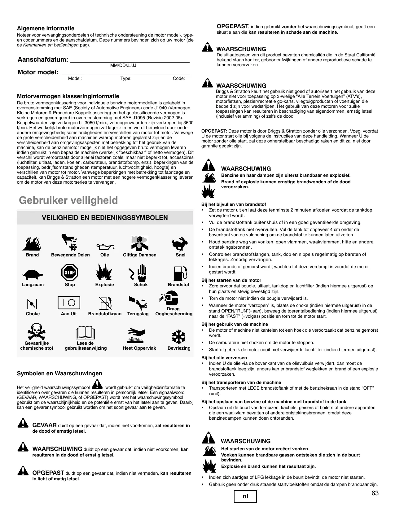 Model: Type: Code: WAARSCHUWING Briggs & Stratton keurt het gebruik niet goed of autoriseert het gebruik van deze motor niet voor toepassing op 3-wielige “Alle Terrein Voertuigen” (ATV’s), motorfietsen, plezier/recreatie go-karts, vliegtuigproducten of voertuigen die bedoeld zijn voor wedstrijden. Het gebruik van deze motoren voor zulke toepassingen kan resulteren in beschadiging van eigendommen, ernstig letsel (inclusief verlamming) of zelfs de dood. Motorvermogen klasseringinformatie De bruto vermogenklassering voor individuele benzine motormodellen is gelabeld in overeenstemming met SAE (Society of Automotive Engineers) code J1940 (Vermogen Kleine Motoren & Procedure Koppelklassering) en het geclassificeerde vermogen is verkregen en gecorrigeerd in overeenstemming met SAE J1995 (Revisie 2002-05). Koppelwaarden zijn verkregen bij 3060 t/min., vermogenwaarden zijn verkregen bij 3600 t/min. Het werkelijk bruto motorvermogen zal lager zijn en wordt beïnvloed door onder andere omgevingsbedrijfsomstandigheden en verschillen van motor tot motor. Vanwege de grote verscheidenheid aan machines waarop motoren geplaatst zijn en de verscheidenheid aan omgevingsaspecten met betrekking tot het gebruik van de machine, kan de benzinemotor mogelijk niet het opgegeven bruto vermogen leveren indien gebruikt in een bepaalde machine (werkelijk “beschikbaar” of netto vermogen). Dit verschil wordt veroorzaakt door allerlei factoren zoals, maar niet beperkt tot, accessoires (luchtfilter, uitlaat, laden, koelen, carburateur, brandstofpomp, enz.), beperkingen van de toepassing, bedrijfsomstandigheden (temperatuur, luchtvochtigheid, hoogte) en verschillen van motor tot motor. Vanwege beperkingen met betrekking tot fabricage en capaciteit, kan Briggs & Stratton een motor met een hogere vermogenklassering leveren om de motor van deze motorseries te vervangen. Gebruiker veiligheid Bewegende Delen Langzaam Choke Stop Aan Uit Olie Explosie Brandstofkraan Giftige Dampen Schok Terugslag WAARSCHUWING Benzine en haar dampen zijn uiterst brandbaar en explosief. Brand of explosie kunnen ernstige brandwonden of de dood veroorzaken. Bij het bijvullen van brandstof