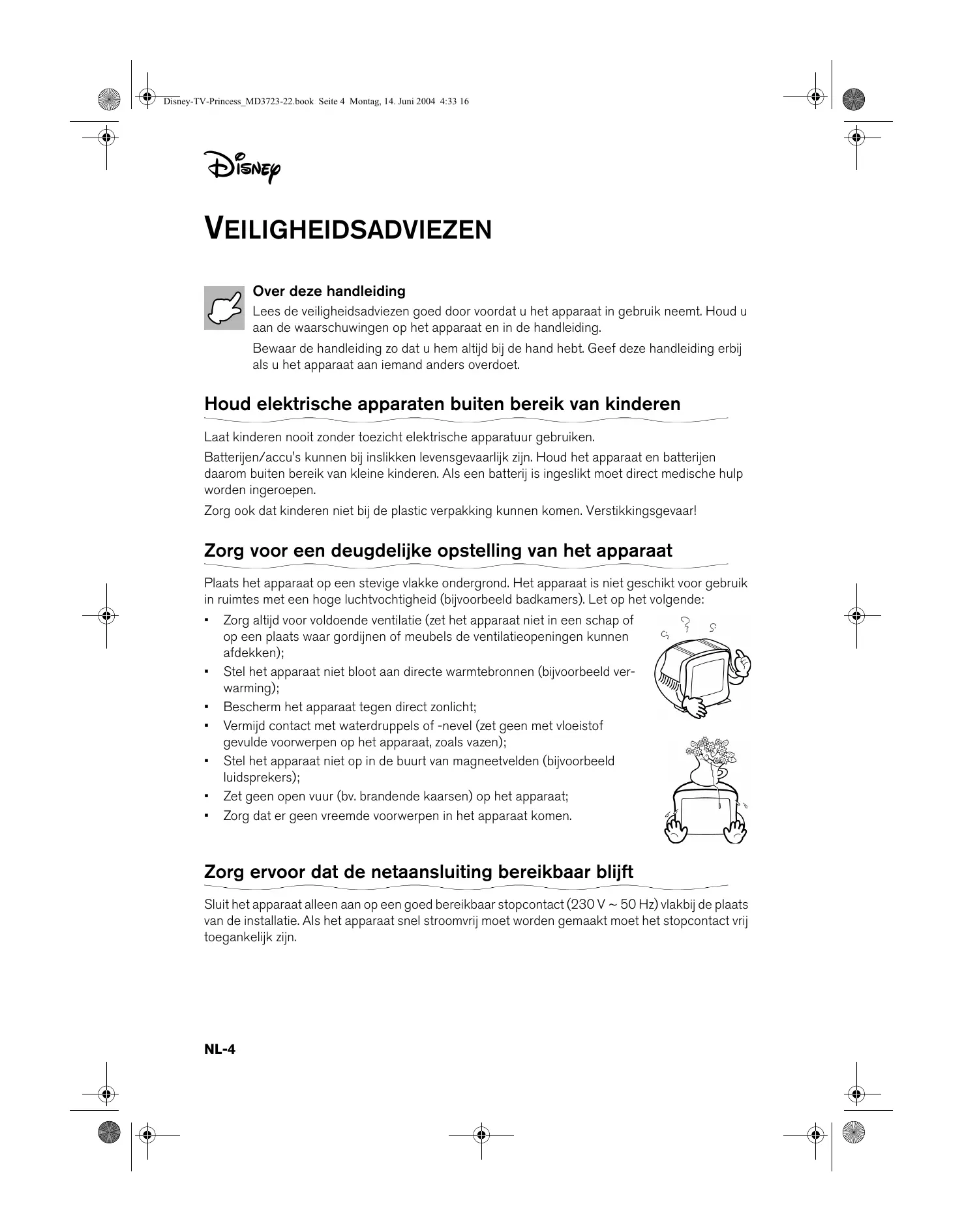 Zorg altijd voor voldoende ventilatie (zet het apparaat niet in een schap of op een plaats waar gordijnen of meubels de ventilatieopeningen kunnen afdekken); Stel het apparaat niet bloot aan directe warmtebronnen (bijvoorbeeld verwarming); Bescherm het apparaat tegen direct zonlicht; Vermijd contact met waterdruppels of -nevel (zet geen met vloeistof gevulde voorwerpen op het apparaat, zoals vazen); Stel het apparaat niet op in de buurt van magneetvelden (bijvoorbeeld luidsprekers); Zet geen open vuur (bv. brandende kaarsen) op het apparaat; Zorg dat er geen vreemde voorwerpen in het apparaat komen. Zorg ervoor dat de netaansluiting bereikbaar blijft Sluit het apparaat alleen aan op een goed bereikbaar stopcontact (230 V ~ 50 Hz) vlakbij de plaats van de installatie. Als het apparaat snel stroomvrij moet worden gemaakt moet het stopcontact vrij toegankelijk zijn. NL-4 Disney-TV-Princess_MD3723-22.book Seite 5 Montag, 14. Juni 2004 4:33 16 Leg het netsnoer zo neer dat het vrijligt, nergens klem raakt, of per ongeluk uit het stopcontact getrokken kan worden. Op de plaats waar het snoer uit het apparaat komt mag er geen trekspanning op het snoer staan. Nooit zelf repareren Trek bij beschadiging van de aansluitstekker, de aansluitkabel of het apparaat meteen de stekker uit het stopcontact. Probeer in geen geval het apparaat zelf te openen en/of te repareren. Daardoor bestaat kans op elektrische schokken. Neem bij storingen contact op met ons Service Center of een ander deskundig reparatiebedrijf. Onweer Trek bij langere afwezigheid of onweer de stekker uit het stopcontact en de antennekabel uit de antenneaansluiting. Demagnetiseren Kleurentelevisies zijn gevoelig voor magnetische invloeden; deze ontstaan als het apparaat op een andere plaats wordt gezet of als bepaalde elektrische apparatuur in de buurt van de televisie wordt gebruikt. Deze magnetische velden kunnen zogenaamde “kleurvlekken” veroorzaken. Zet het apparaat geheel uit als dergelijke vlekken optreden en laat het tenminste 60 minuten uitgeschakeld. Bij het inschakelen wordt het apparaat vervolgens gedemagnetiseerd. Röntgenstraling De in dit apparaat optredende röntgenstraling is volgens de daarvoor geldende bepalingen voldoende afgeschermd. Het apparaat schoonmaken Trek voor het schoonmaken de netstekker uit de contactdoos. Gebruik voor het reinigen een droog zacht doekje. Gebruik geen chemische oplos- en schoonmaakmiddelen omdat deze het oppervlak van het apparaat en/of de teksten kunnen beschadigen. NL-5 Disney-TV-Princess_MD3723-22.book Seite 6 Montag, 14. Juni 2004 4:33 16