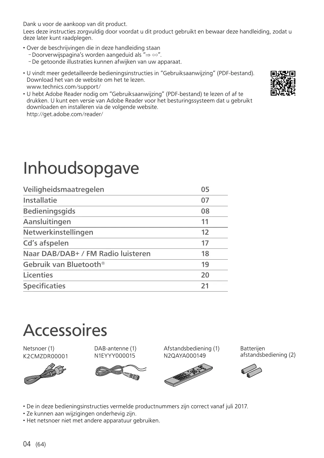 Dank u voor de aankoop van dit product. Lees deze instructies zorgvuldig door voordat u dit product gebruikt en bewaar deze handleiding, zodat u deze later kunt raadplegen. • Over de beschrijvingen die in deze handleiding staan - Doorverwijspagina’s worden aangeduid als “ ○○”. - De getoonde illustraties kunnen afwijken van uw apparaat. • U vindt meer gedetailleerde bedieningsinstructies in “Gebruiksaanwijzing” (PDF-bestand). Download het van de website om het te lezen. www.technics.com/support/ • U hebt Adobe Reader nodig om “Gebruiksaanwijzing” (PDF-bestand) te lezen of af te drukken. U kunt een versie van Adobe Reader voor het besturingssysteem dat u gebruikt downloaden en installeren via de volgende website. http://get.adobe.com/reader/