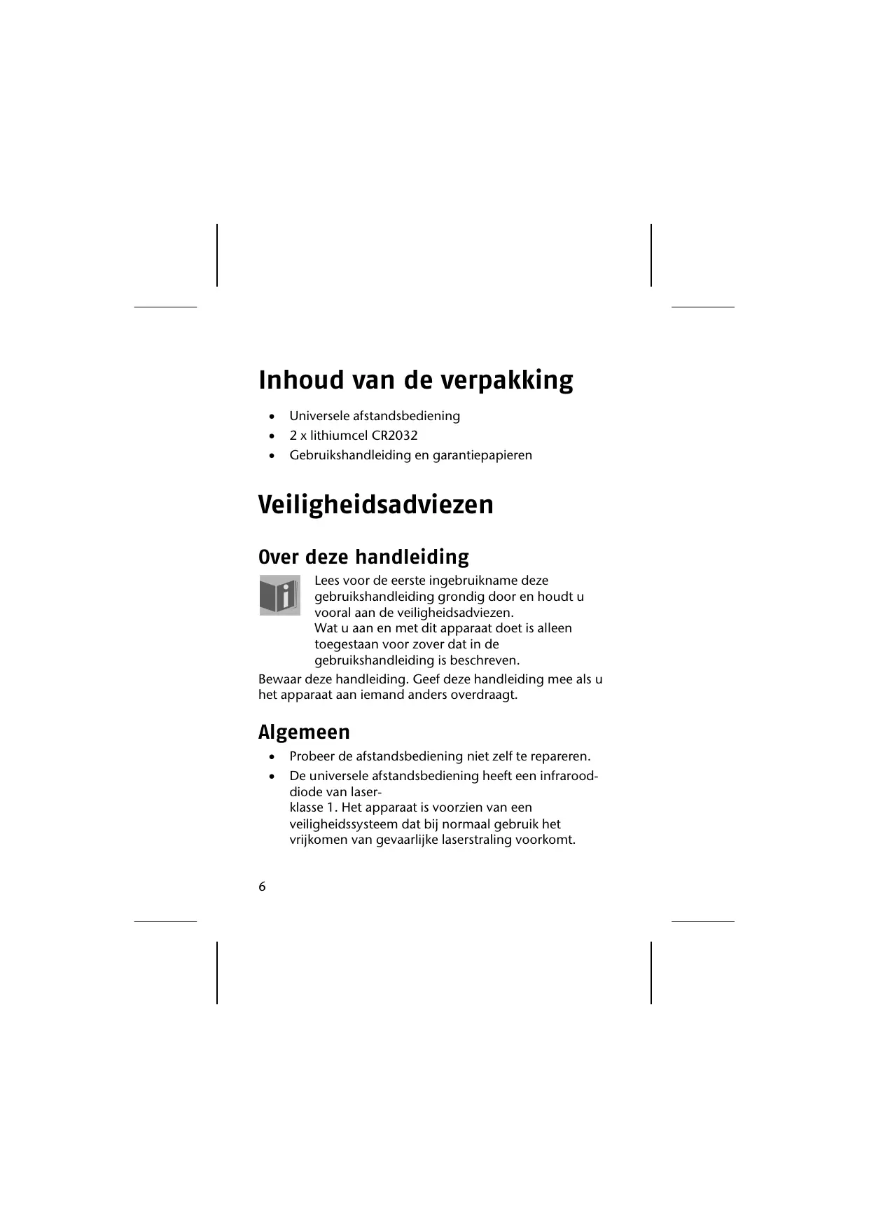 Universele afstandsbediening 2 x lithiumcel CR2032 Gebruikshandleiding en garantiepapieren Veiligheidsadviezen Over deze handleiding Lees voor de eerste ingebruikname deze gebruikshandleiding grondig door en houdt u vooral aan de veiligheidsadviezen. Wat u aan en met dit apparaat doet is alleen toegestaan voor zover dat in de gebruikshandleiding is beschreven. Bewaar deze handleiding. Geef deze handleiding mee als u het apparaat aan iemand anders overdraagt. Algemeen