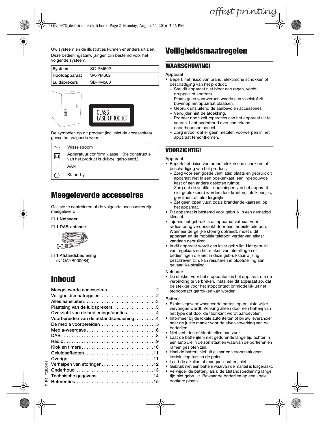 offest printing TQBJ0978_de.fr.it.nl.se.dk.fi.book Page 2 Monday, August 22, 2016 3:26 PM Uw systeem en de illustraties kunnen er anders uit zien. Deze bedieningsaanwijzingen zijn bestemd voor het volgende systeem. Systeem SC-PM602 Hoofdapparaat SA-PM602 Luidsprekers SB-PM500 De symbolen op dit product (inclusief de accessoires) geven het volgende weer: Wisselstroom Apparatuur conform klasse II (de constructie van het product is dubbel geïsoleerd.) AAN Stand-by Meegeleverde accessoires Gelieve te controleren of de volgende accessoires zijn meegeleverd. 1 Netsnoer 1 DAB-antenne 1 Afstandsbediening (N2QAYB000984) TQBJ0978 Inhoud