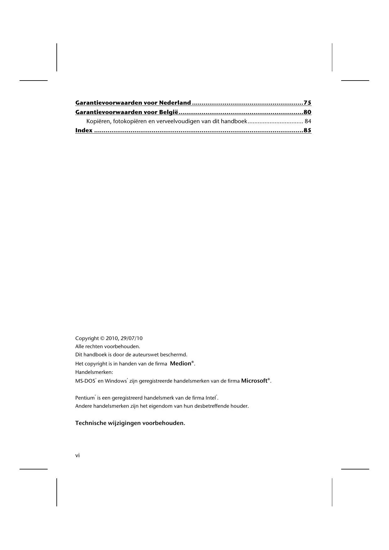 Copyright © 2010, 29/07/10 Alle rechten voorbehouden. Dit handboek is door de auteurswet beschermd. Het copyright is in handen van de firma Medion®. Handelsmerken: ®