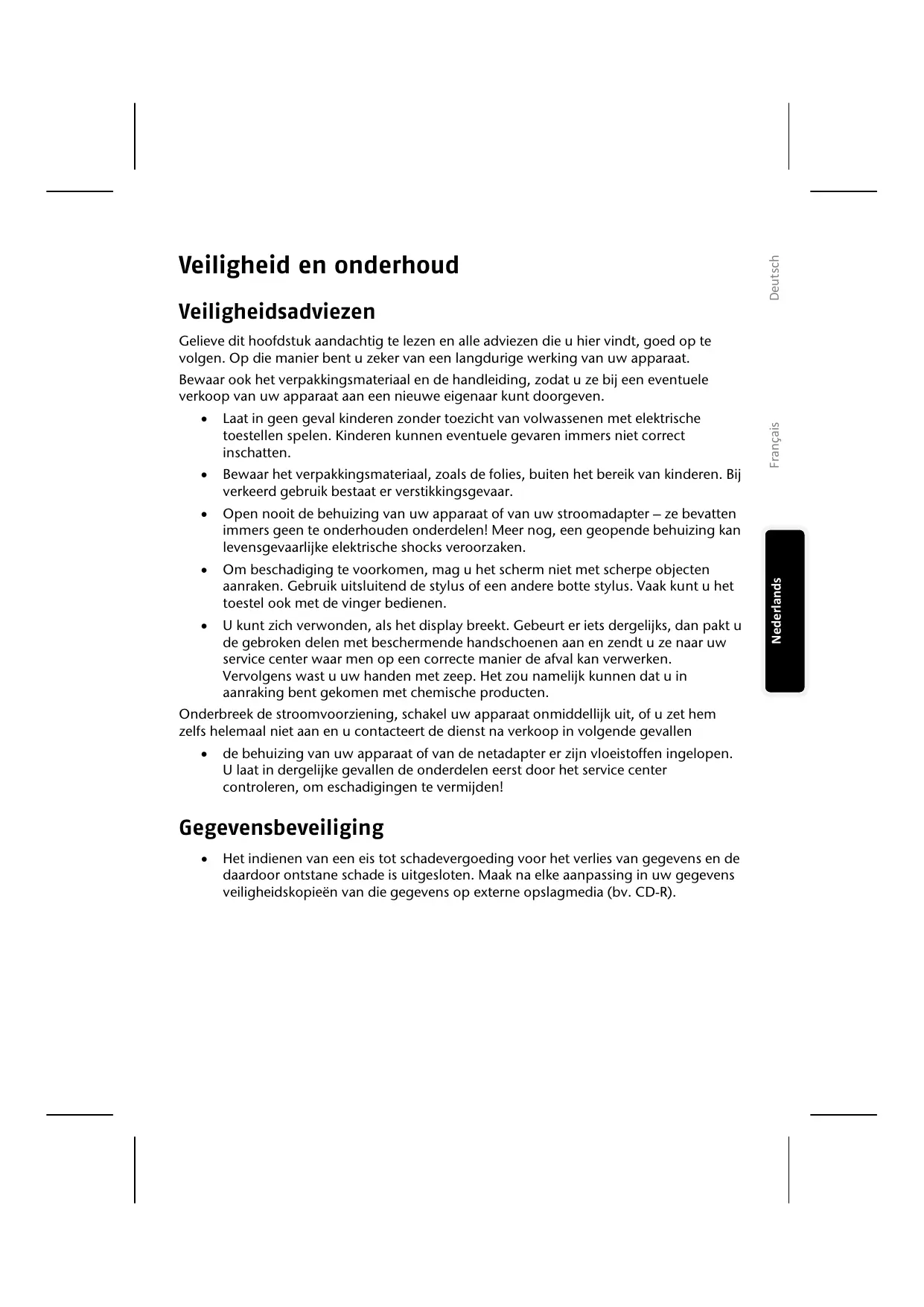 Veiligheid en onderhoud Veiligheidsadviezen Gelieve dit hoofdstuk aandachtig te lezen en alle adviezen die u hier vindt, goed op te volgen. Op die manier bent u zeker van een langdurige werking van uw apparaat.